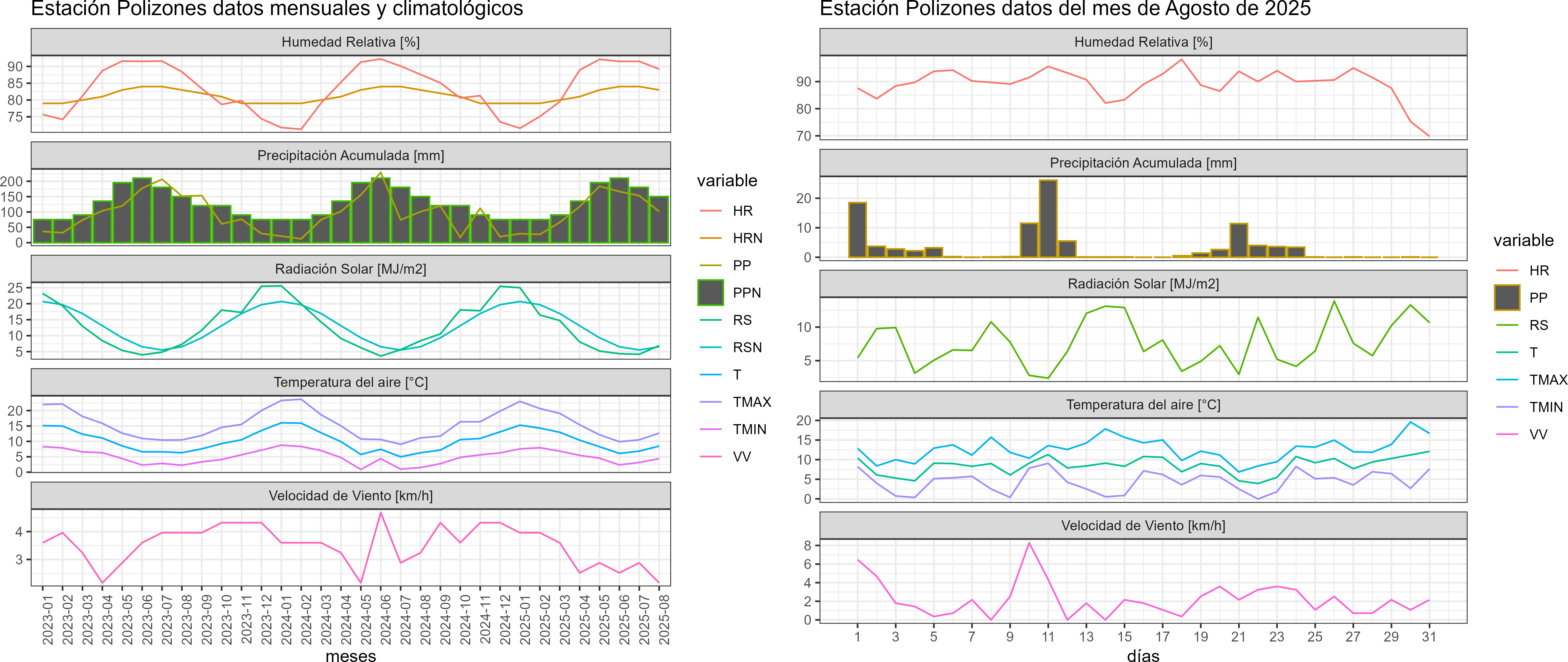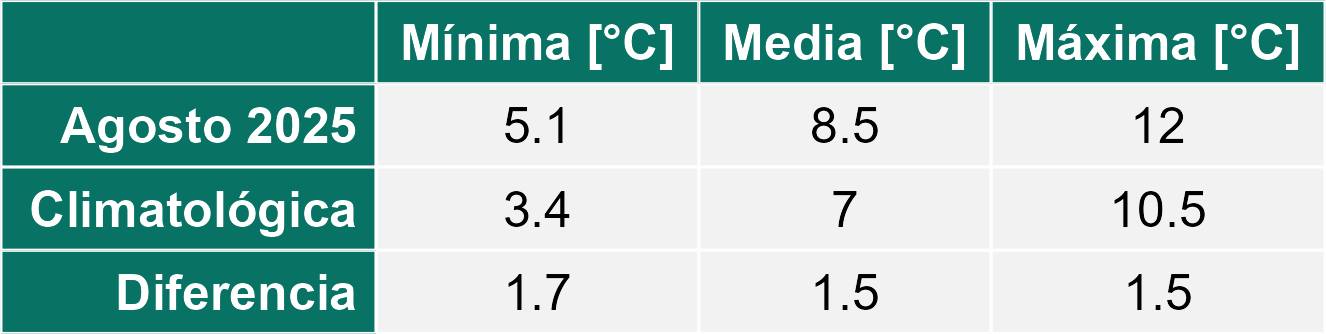 La estación Polizones corresponde al distrito agroclimático 14-10-1. Para este distrito climático la temperatura mínima, media y máxima climatológicas alcanzan los 3.2°C, 7.2°C y 11.2°C respectivamente. Por su parte, respecto a las temperaturas medidas durante el mes de agosto en la estación: la temperatura mínima alcanzo los 4.4°C (1.2°C sobre la climatológica), la temperatura media 8.5°C (1.3°C sobre la climatológica) y la temperatura máxima llegó a los 12.7°C (1.5°C sobre la climatológica). En el mes de agosto se registró una pluviometría de 101.5 mm, lo cual representa un 51.5% con respecto al mismo mes de un año normal. De enero a agosto se ha registrado un total acumulado de 844.5 mm, en circunstancias que un año normal registraría a la fecha 1183 mm, lo que representa un déficit de 28.6%. A la misma fecha, durante el año 2024 la precipitación alcanzaba los 100.9 mm.