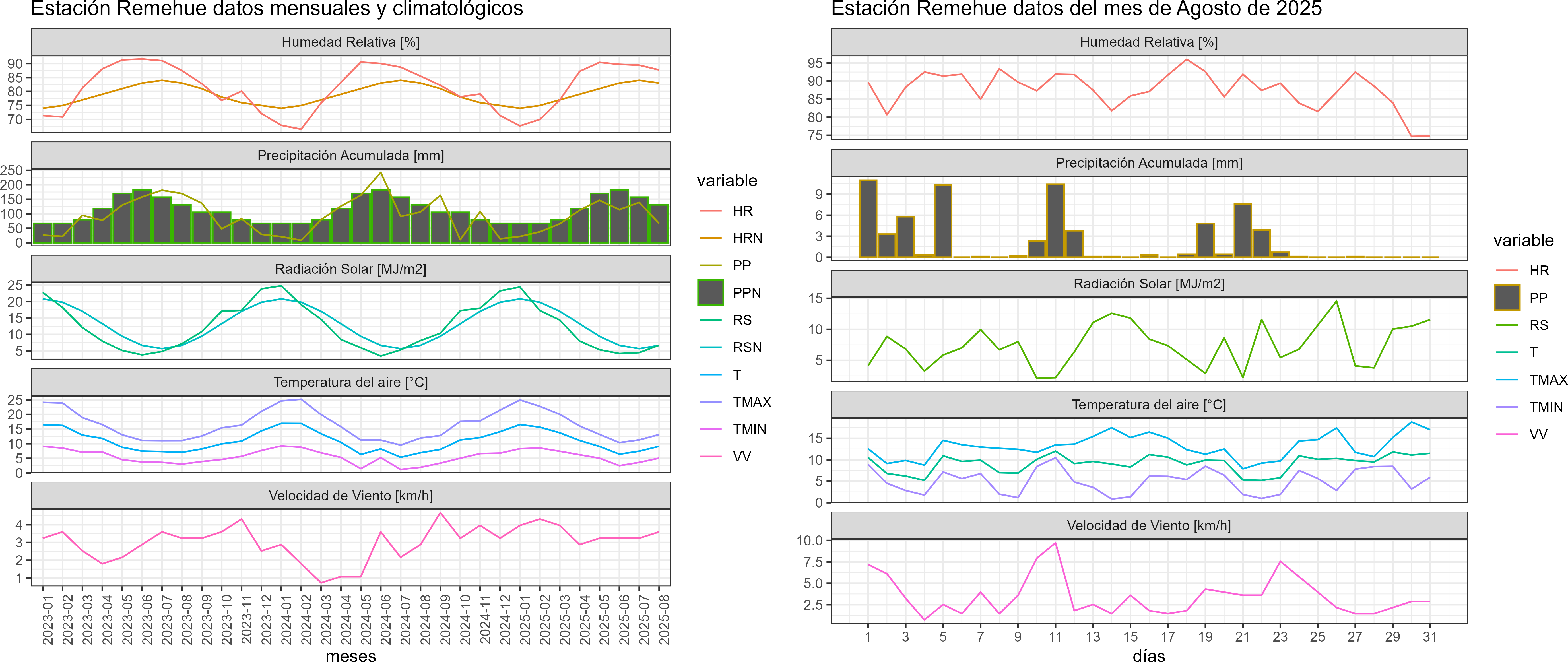 La estación Remehue corresponde al distrito agroclimático 14-10-2. Para este distrito climático la temperatura mínima, media y máxima climatológicas alcanzan los 3.8°C, 8°C y 12.3°C respectivamente. Por su parte, respecto a las temperaturas medidas durante el mes de agosto en la estación: la temperatura mínima alcanzo los 5.1°C (1.3°C sobre la climatológica), la temperatura media 9.1°C (1.1°C sobre la climatológica) y la temperatura máxima llegó a los 13.1°C (0.8°C sobre la climatológica). En el mes de agosto se registró una pluviometría de 66 mm, lo cual representa un 39.3% con respecto al mismo mes de un año normal. De enero a agosto se ha registrado un total acumulado de 702.2 mm, en circunstancias que un año normal registraría a la fecha 977 mm, lo que representa un déficit de 28.1%. A la misma fecha, durante el año 2024 la precipitación alcanzaba los 106.4 mm.