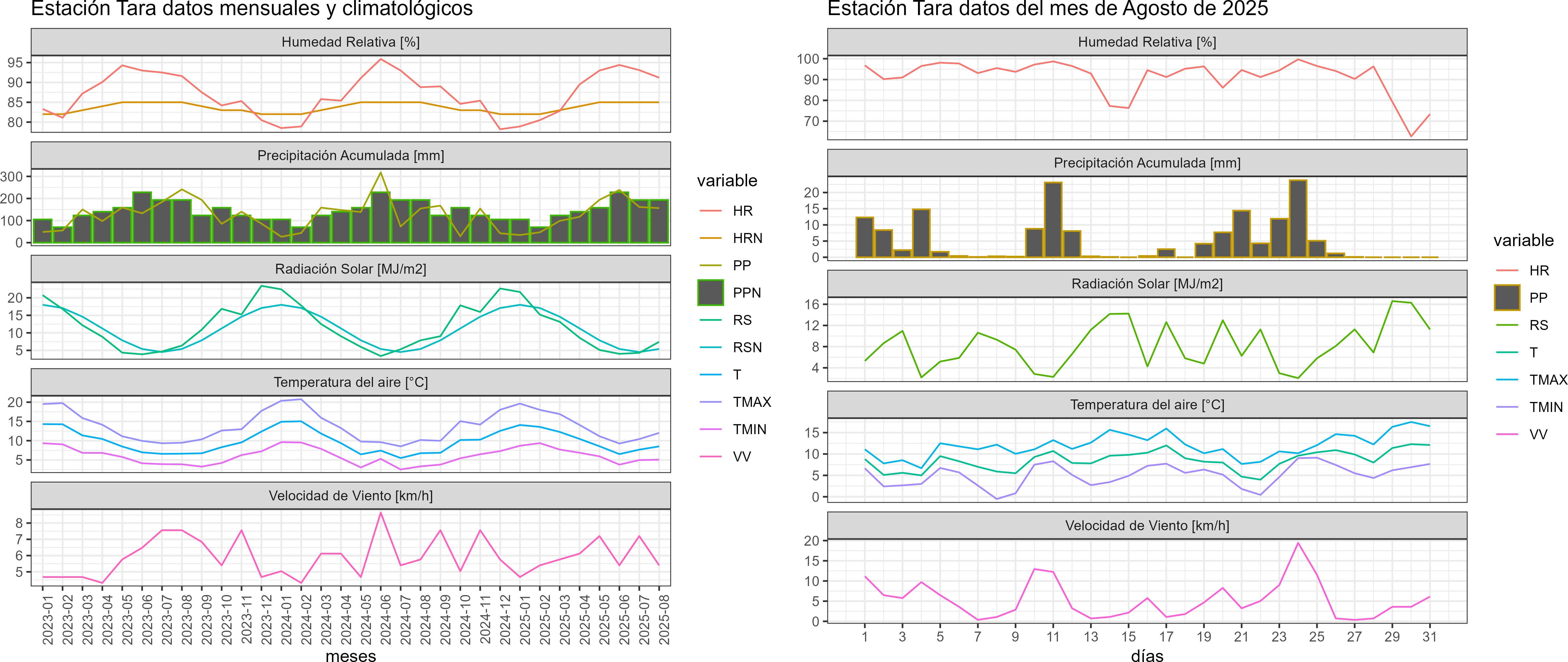 La estación Tara corresponde al distrito agroclimático 10-4. Para este distrito climático la temperatura mínima, media y máxima climatológicas alcanzan los 3.4°C, 7°C y 10.5°C respectivamente. Por su parte, respecto a las temperaturas medidas durante el mes de agosto en la estación: la temperatura mínima alcanzo los 5.1°C (1.7°C sobre la climatológica), la temperatura media 8.5°C (1.5°C sobre la climatológica) y la temperatura máxima llegó a los 12°C (1.5°C sobre la climatológica). En el mes de agosto se registró una pluviometría de 156.4 mm, lo cual representa un 75.6% con respecto al mismo mes de un año normal. De enero a agosto se ha registrado un total acumulado de 1047.2 mm, en circunstancias que un año normal registraría a la fecha 1205 mm, lo que representa un déficit de 13.1%. A la misma fecha, durante el año 2024 la precipitación alcanzaba los 154.8 mm.