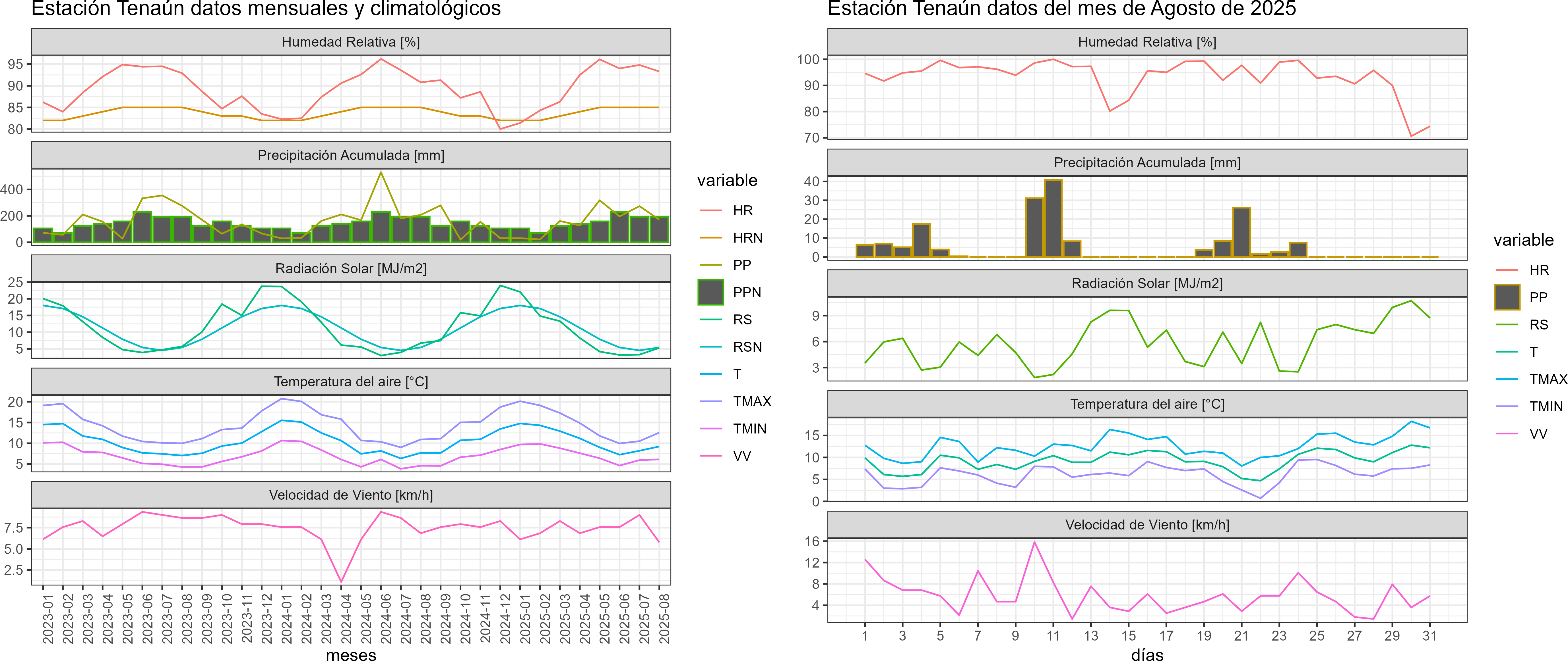 La estación Tenaún corresponde al distrito agroclimático 10-4. Para este distrito climático la temperatura mínima, media y máxima climatológicas alcanzan los 4.5°C, 7.4°C y 10.4°C respectivamente. Por su parte, respecto a las temperaturas medidas durante el mes de agosto en la estación: la temperatura mínima alcanzo los 6.1°C (1.6°C sobre la climatológica), la temperatura media 9.2°C (1.8°C sobre la climatológica) y la temperatura máxima llegó a los 12.6°C (2.2°C sobre la climatológica). En el mes de agosto se registró una pluviometría de 170.6 mm, lo cual representa un 70.8% con respecto al mismo mes de un año normal. De enero a agosto se ha registrado un total acumulado de 1298.8 mm, en circunstancias que un año normal registraría a la fecha 1391 mm, lo que representa un déficit de 6.6%. A la misma fecha, durante el año 2024 la precipitación alcanzaba los 207.3 mm.