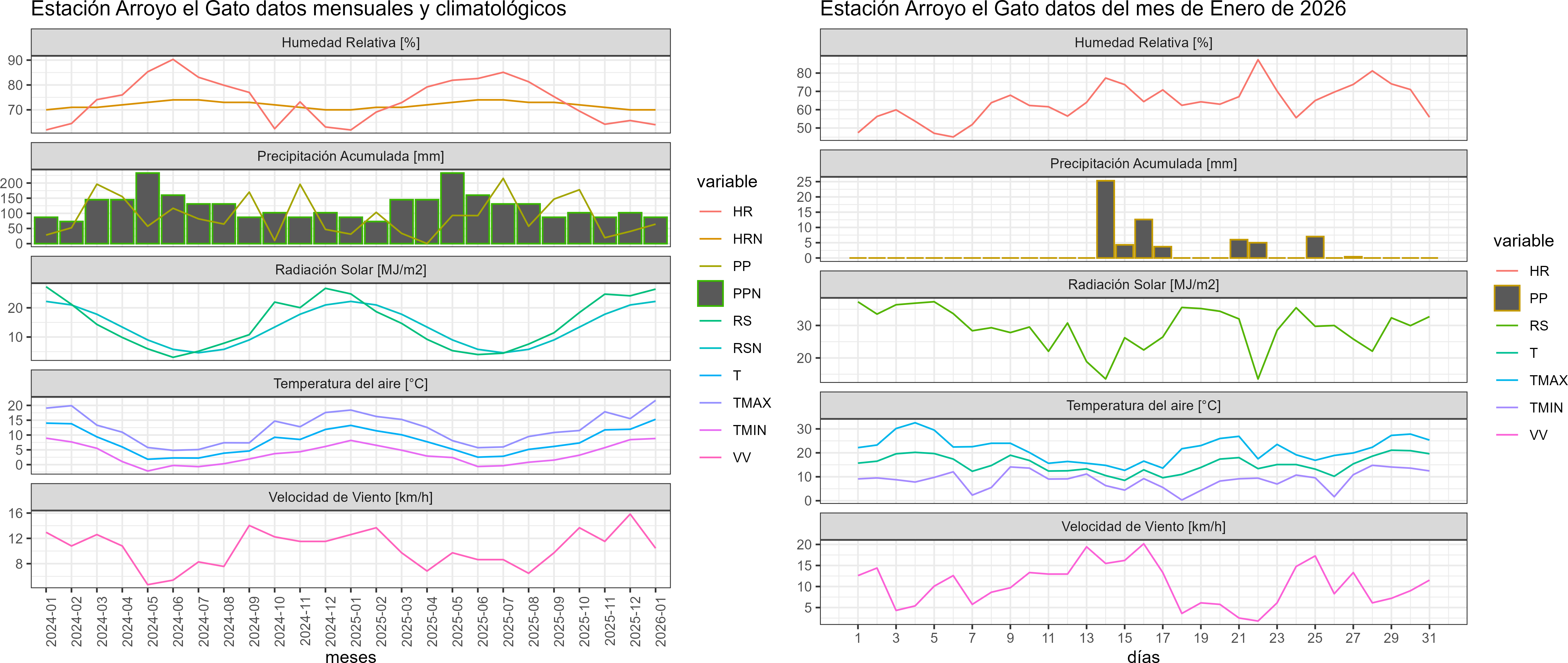 La estación Arroyo el Gato corresponde al distrito agroclimático 11-12-9. Para este distrito climático la temperatura mínima, media y máxima climatológicas alcanzan los 7°C, 12.3°C y 17.5°C respectivamente. Por su parte, respecto a las temperaturas medidas durante el mes de enero en la estación: la temperatura mínima alcanzo los 8.8°C (1.8°C sobre la climatológica), la temperatura media 15.3°C (3°C sobre la climatológica) y la temperatura máxima llegó a los 21.7°C (4.2°C sobre la climatológica). En el mes de enero se registró una pluviometría de 64.3 mm, lo cual representa un 126.1% con respecto al mismo mes de un año normal. De enero a enero se ha registrado un total acumulado de 64.3 mm, en circunstancias que un año normal registraría a la fecha 51 mm, lo que representa un superávit de 26.1%. A la misma fecha, durante el año 2024 la precipitación alcanzaba los 31.3 mm.