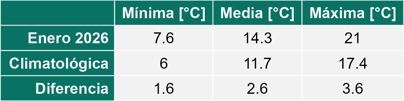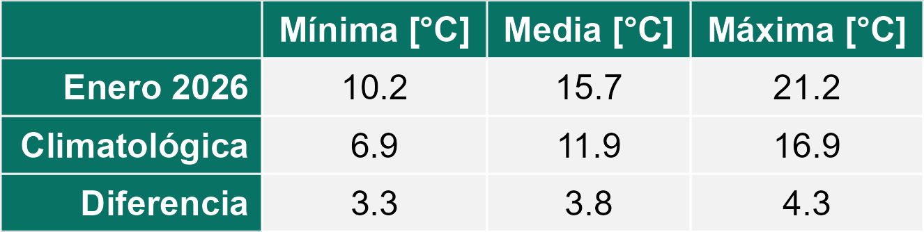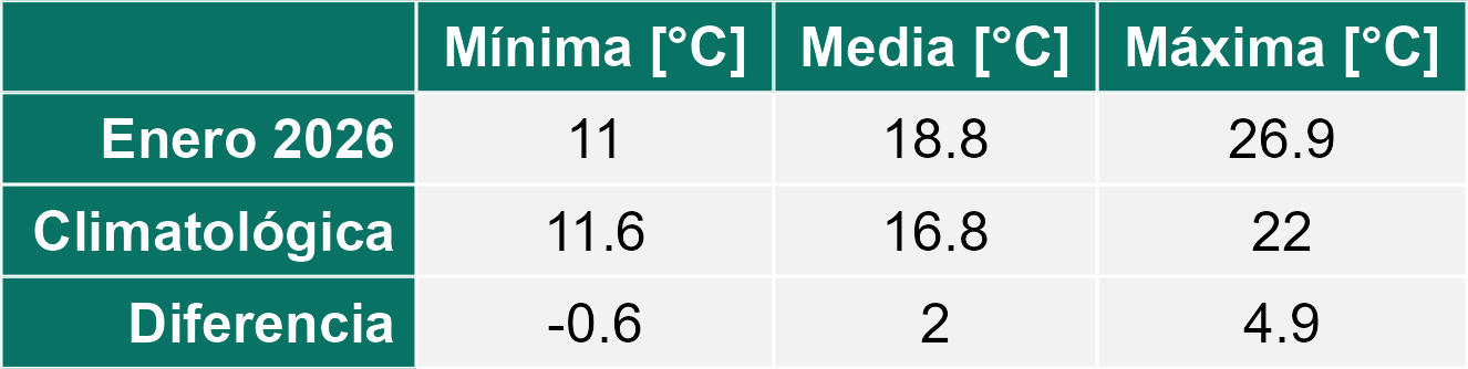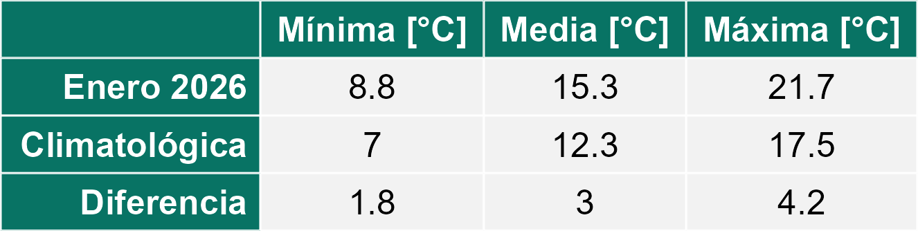 La Zona Húmeda, durante enero, acumuló un promedio de 109,5 mm de precipitación, equivalente a un 41% menos que el promedio histórico (187 mm). La temperatura media alcanzó 16,6 °C, aproximadamente 2,7 °C sobre lo normal, explicado por un aumento tanto de las temperaturas mínimas como máximas.