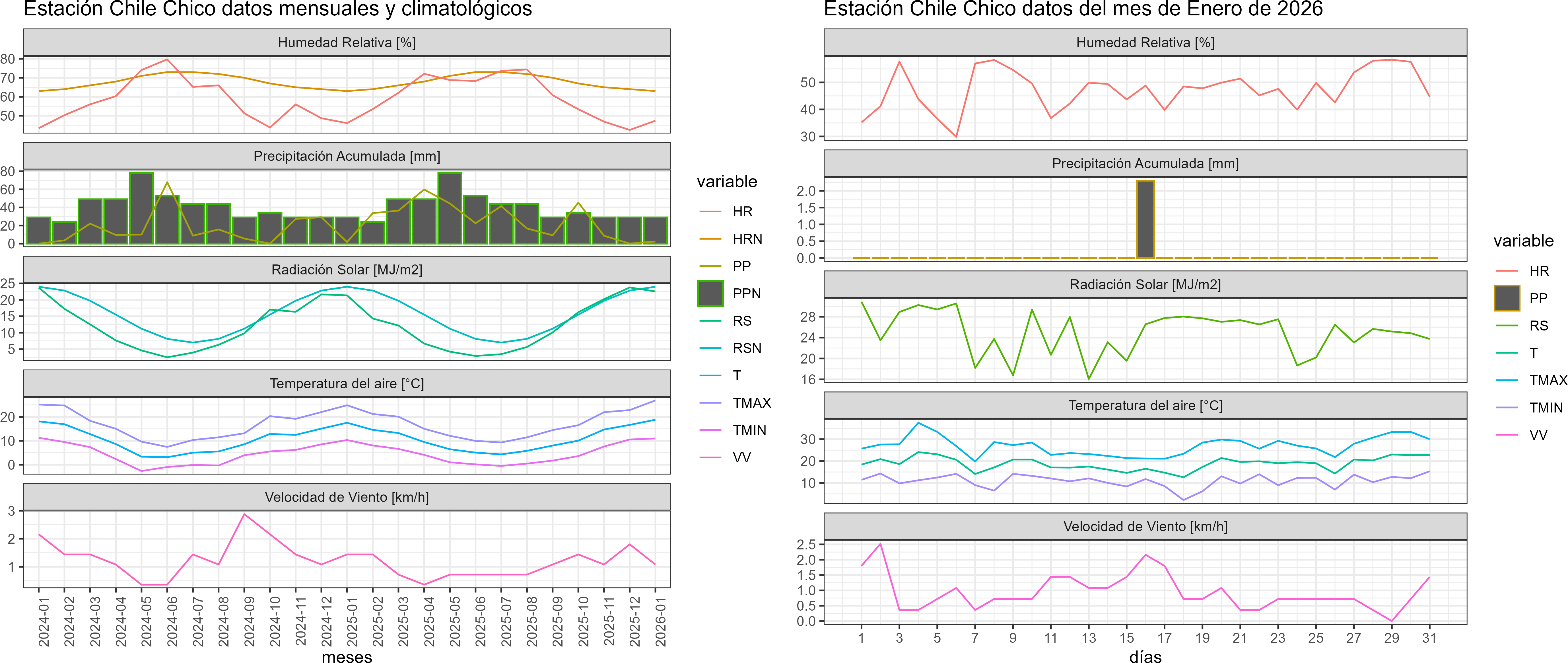 La estación Chile Chico corresponde al distrito agroclimático 11-4. Para este distrito climático la temperatura mínima, media y máxima climatológicas alcanzan los 11.6°C, 16.8°C y 22°C respectivamente. Por su parte, respecto a las temperaturas medidas durante el mes de enero en la estación: la temperatura mínima alcanzo los 11°C (-0.6°C bajo la climatológica), la temperatura media 18.8°C (2°C sobre la climatológica) y la temperatura máxima llegó a los 26.9°C (4.9°C sobre la climatológica). En el mes de enero se registró una pluviometría de 2.3 mm, lo cual representa un 46% con respecto al mismo mes de un año normal. De enero a enero se ha registrado un total acumulado de 2.3 mm, en circunstancias que un año normal registraría a la fecha 5 mm, lo que representa un déficit de 54%. A la misma fecha, durante el año 2024 la precipitación alcanzaba los 1.7 mm.