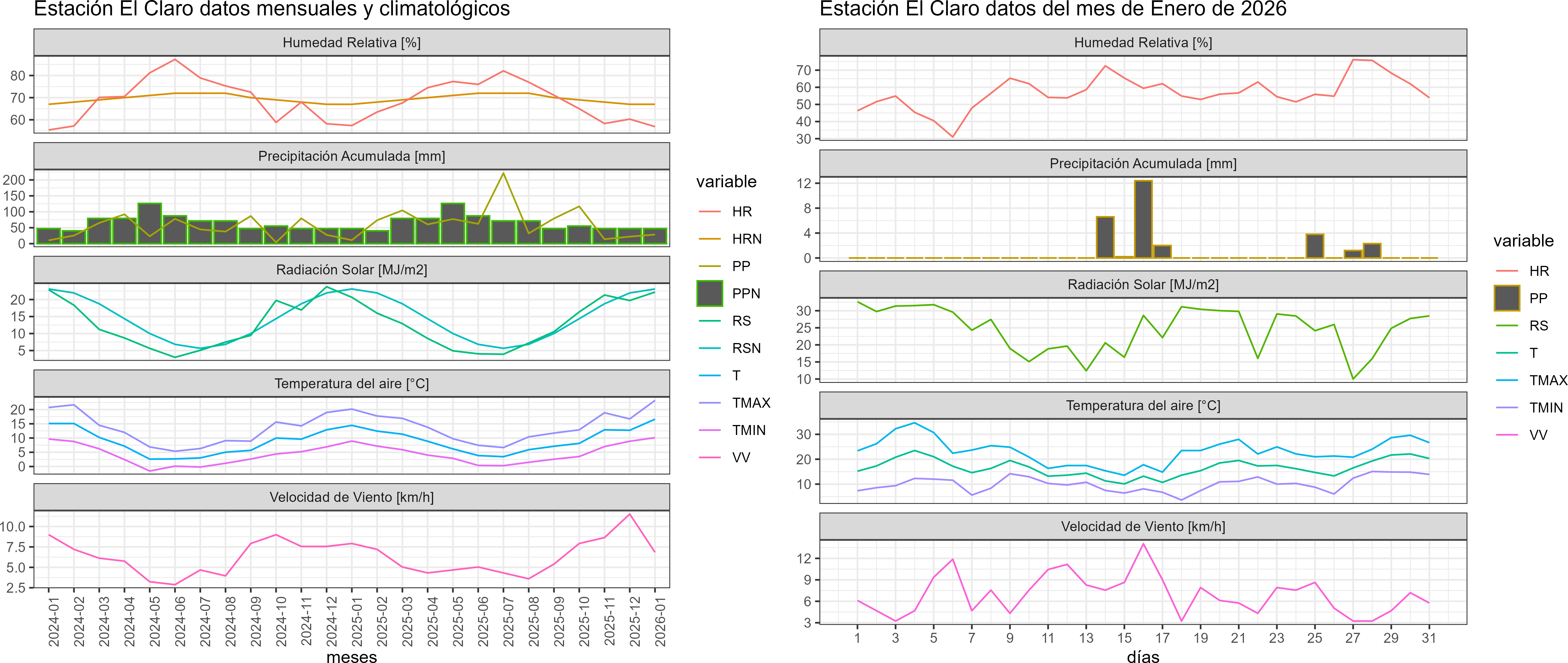 La estación El Claro corresponde al distrito agroclimático 11-3. Para este distrito climático la temperatura mínima, media y máxima climatológicas alcanzan los 7.8°C, 13.2°C y 18.7°C respectivamente. Por su parte, respecto a las temperaturas medidas durante el mes de enero en la estación: la temperatura mínima alcanzo los 10.1°C (2.3°C sobre la climatológica), la temperatura media 16.6°C (3.4°C sobre la climatológica) y la temperatura máxima llegó a los 23.2°C (4.5°C sobre la climatológica). En el mes de enero se registró una pluviometría de 28.5 mm, lo cual representa un 58.2% con respecto al mismo mes de un año normal. De enero a enero se ha registrado un total acumulado de 28.5 mm, en circunstancias que un año normal registraría a la fecha 49 mm, lo que representa un déficit de 41.8%. A la misma fecha, durante el año 2024 la precipitación alcanzaba los 10.9 mm.