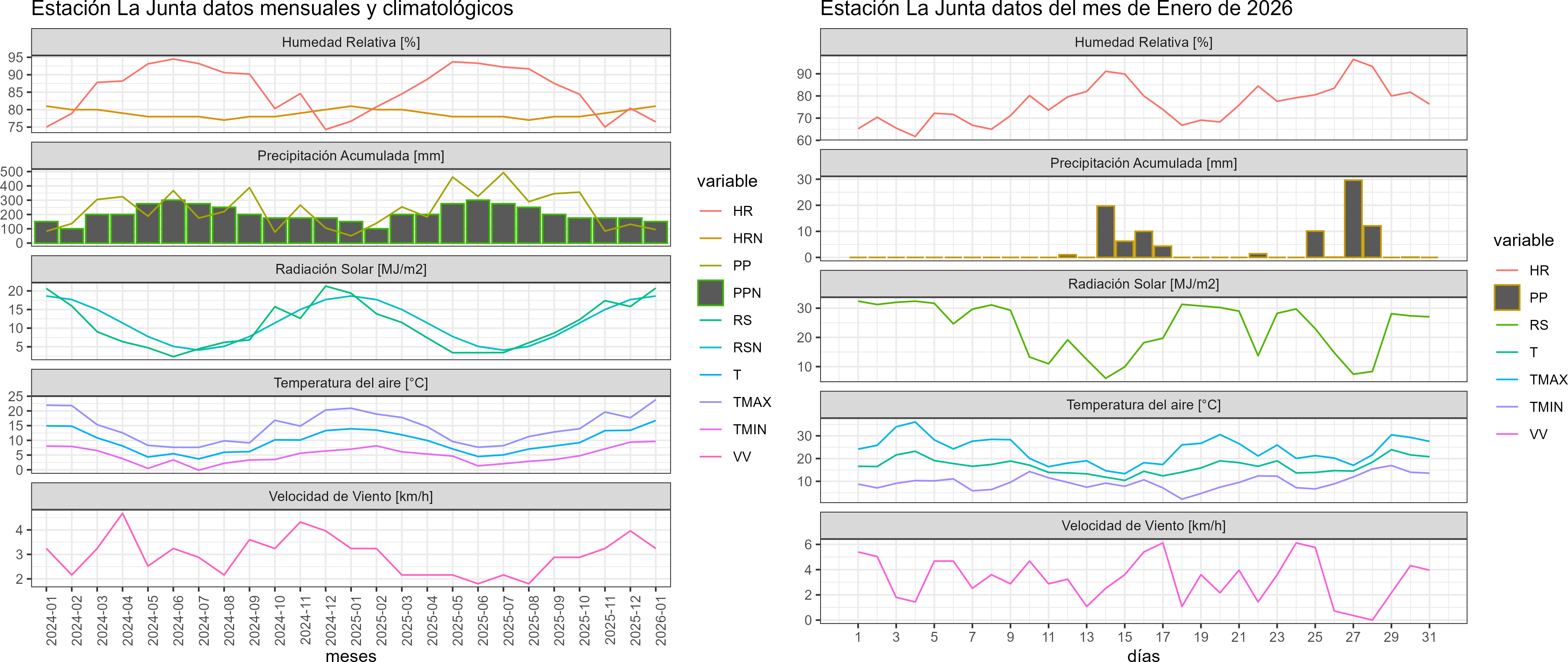 La estación La Junta corresponde al distrito agroclimático 10-11-1. Para este distrito climático la temperatura mínima, media y máxima climatológicas alcanzan los 8.6°C, 14°C y 19.4°C respectivamente. Por su parte, respecto a las temperaturas medidas durante el mes de enero en la estación: la temperatura mínima alcanzo los 9.6°C (1°C sobre la climatológica), la temperatura media 16.7°C (2.7°C sobre la climatológica) y la temperatura máxima llegó a los 23.8°C (4.4°C sobre la climatológica). En el mes de enero se registró una pluviometría de 94.6 mm, lo cual representa un 69.1% con respecto al mismo mes de un año normal. De enero a enero se ha registrado un total acumulado de 94.6 mm, en circunstancias que un año normal registraría a la fecha 137 mm, lo que representa un déficit de 30.9%. A la misma fecha, durante el año 2024 la precipitación alcanzaba los 51.2 mm.