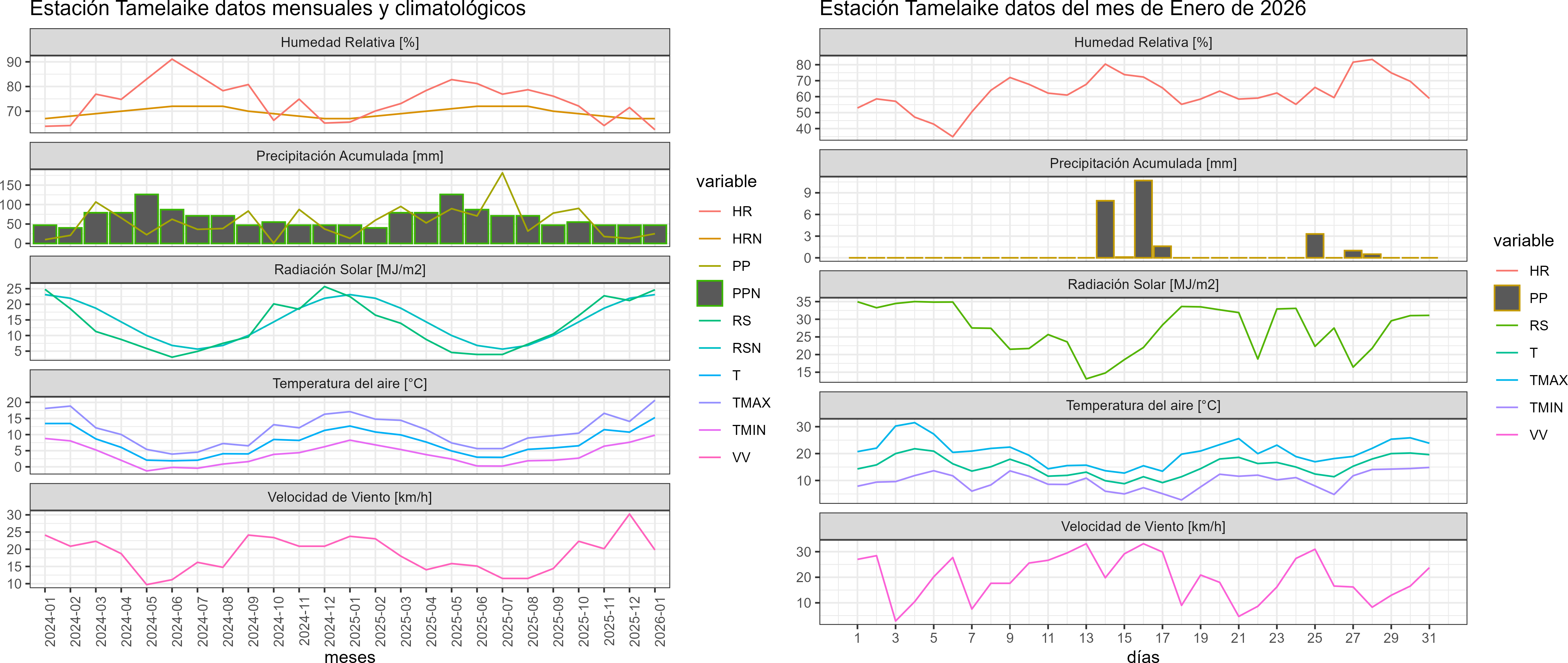 La estación Tamelaike corresponde al distrito agroclimático 11-3. Para este distrito climático la temperatura mínima, media y máxima climatológicas alcanzan los 7.1°C, 12.4°C y 17.7°C respectivamente. Por su parte, respecto a las temperaturas medidas durante el mes de enero en la estación: la temperatura mínima alcanzo los 9.8°C (2.7°C sobre la climatológica), la temperatura media 15.3°C (2.9°C sobre la climatológica) y la temperatura máxima llegó a los 20.7°C (3°C sobre la climatológica). En el mes de enero se registró una pluviometría de 25.1 mm, lo cual representa un 38.6% con respecto al mismo mes de un año normal. De enero a enero se ha registrado un total acumulado de 25.1 mm, en circunstancias que un año normal registraría a la fecha 65 mm, lo que representa un déficit de 61.4%. A la misma fecha, durante el año 2024 la precipitación alcanzaba los 13.3 mm.