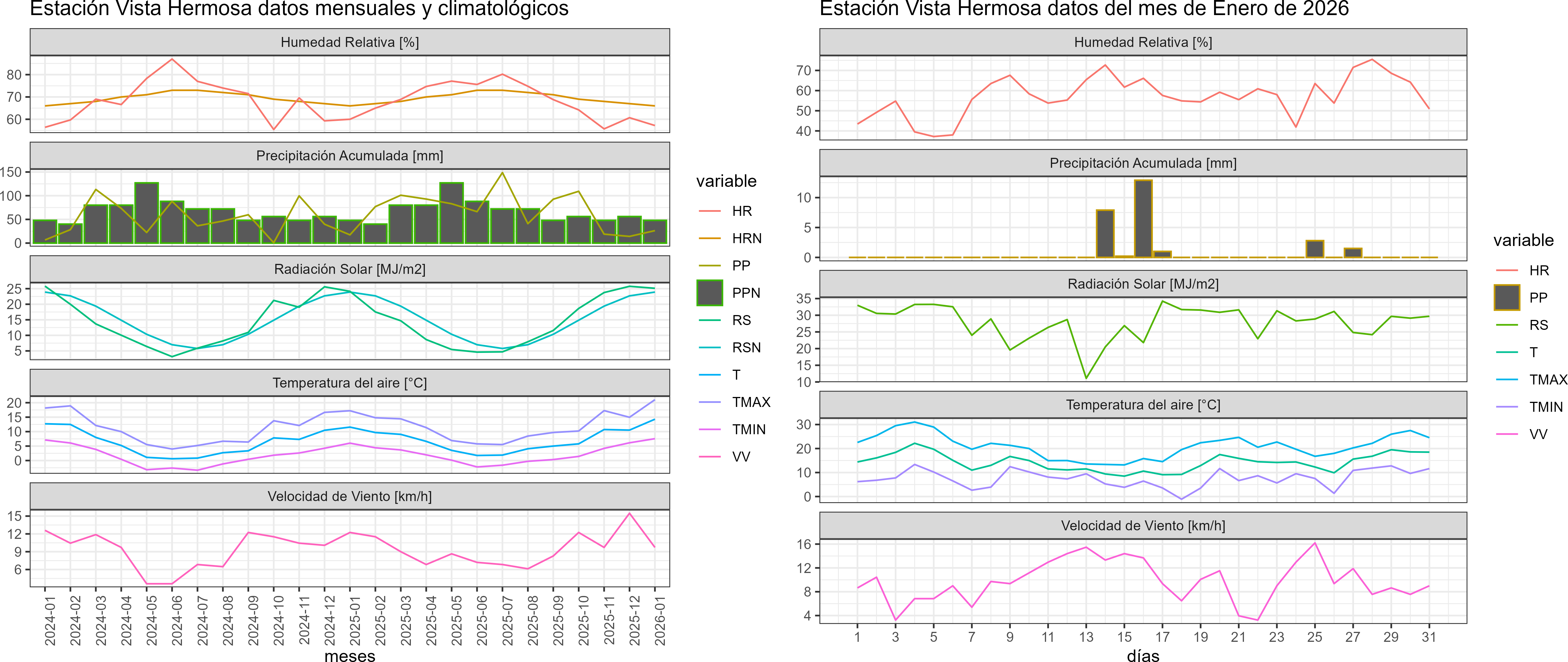 La estación Vista Hermosa corresponde al distrito agroclimático 11-12-11. Para este distrito climático la temperatura mínima, media y máxima climatológicas alcanzan los 6°C, 11.7°C y 17.4°C respectivamente. Por su parte, respecto a las temperaturas medidas durante el mes de enero en la estación: la temperatura mínima alcanzo los 7.6°C (1.6°C sobre la climatológica), la temperatura media 14.3°C (2.6°C sobre la climatológica) y la temperatura máxima llegó a los 21°C (3.6°C sobre la climatológica). En este sector, se registró sólo un evento de heladas, con una temperatura mínima absoluta de -1°C. En el mes de enero se registró una pluviometría de 26.3 mm, lo cual representa un 53.7% con respecto al mismo mes de un año normal. De enero a enero se ha registrado un total acumulado de 26.3 mm, en circunstancias que un año normal registraría a la fecha 49 mm, lo que representa un déficit de 46.3%. A la misma fecha, durante el año 2024 la precipitación alcanzaba los 17.4 mm.