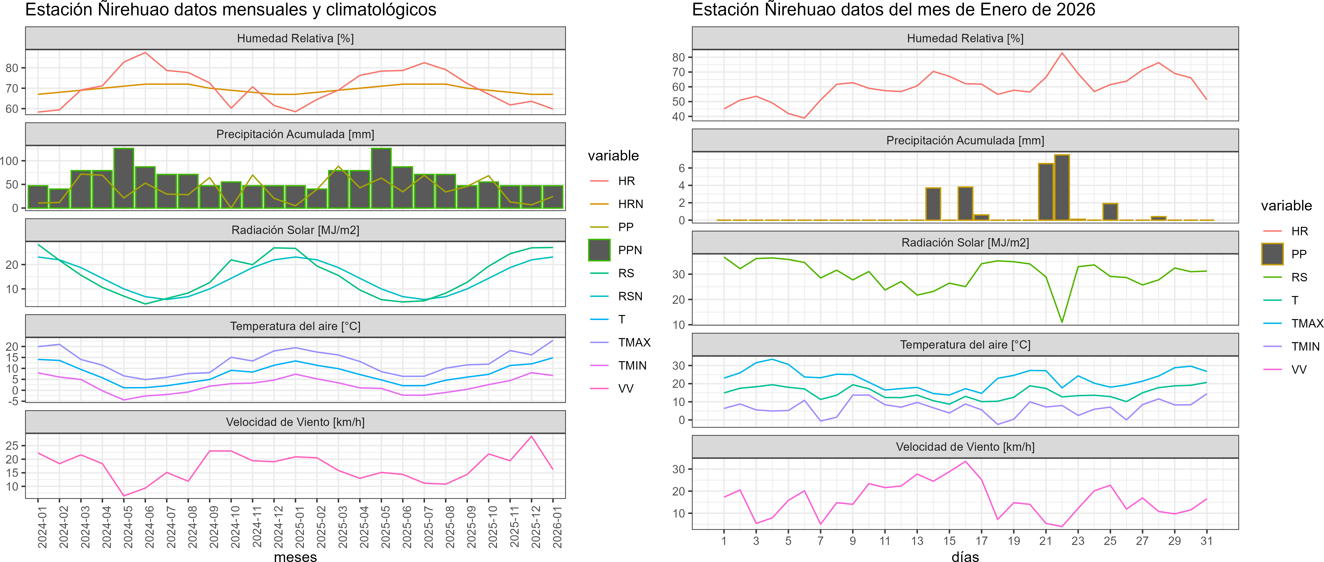 La estación Ñirehuao corresponde al distrito agroclimático 11-3. Para este distrito climático la temperatura mínima, media y máxima climatológicas alcanzan los 7.2°C, 12.8°C y 18.3°C respectivamente. Por su parte, respecto a las temperaturas medidas durante el mes de enero en la estación: la temperatura mínima alcanzo los 6.8°C (-0.4°C bajo la climatológica), la temperatura media 14.9°C (2.1°C sobre la climatológica) y la temperatura máxima llegó a los 22.8°C (4.5°C sobre la climatológica). En esta localidad se registraron dos eventos de heladas, con una mínima absoluta de - 2,5 °C. En el mes de enero se registró una pluviometría de 24.5 mm, lo cual representa un 84.5% con respecto al mismo mes de un año normal. De enero a enero se ha registrado un total acumulado de 24.5 mm, en circunstancias que un año normal registraría a la fecha 29 mm, lo que representa un déficit de 15.5%. A la misma fecha, durante el año 2024 la precipitación alcanzaba los 4.8 mm.