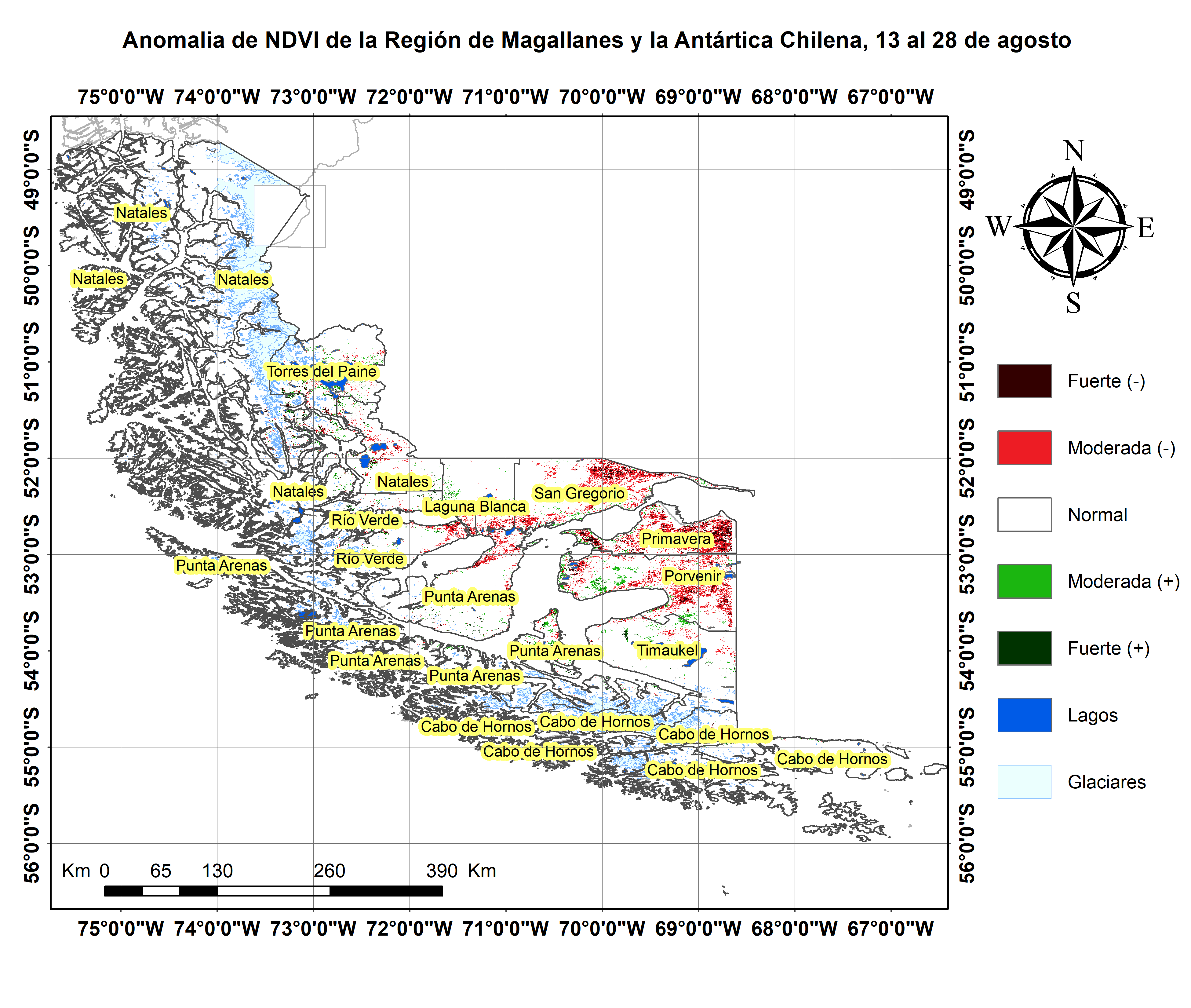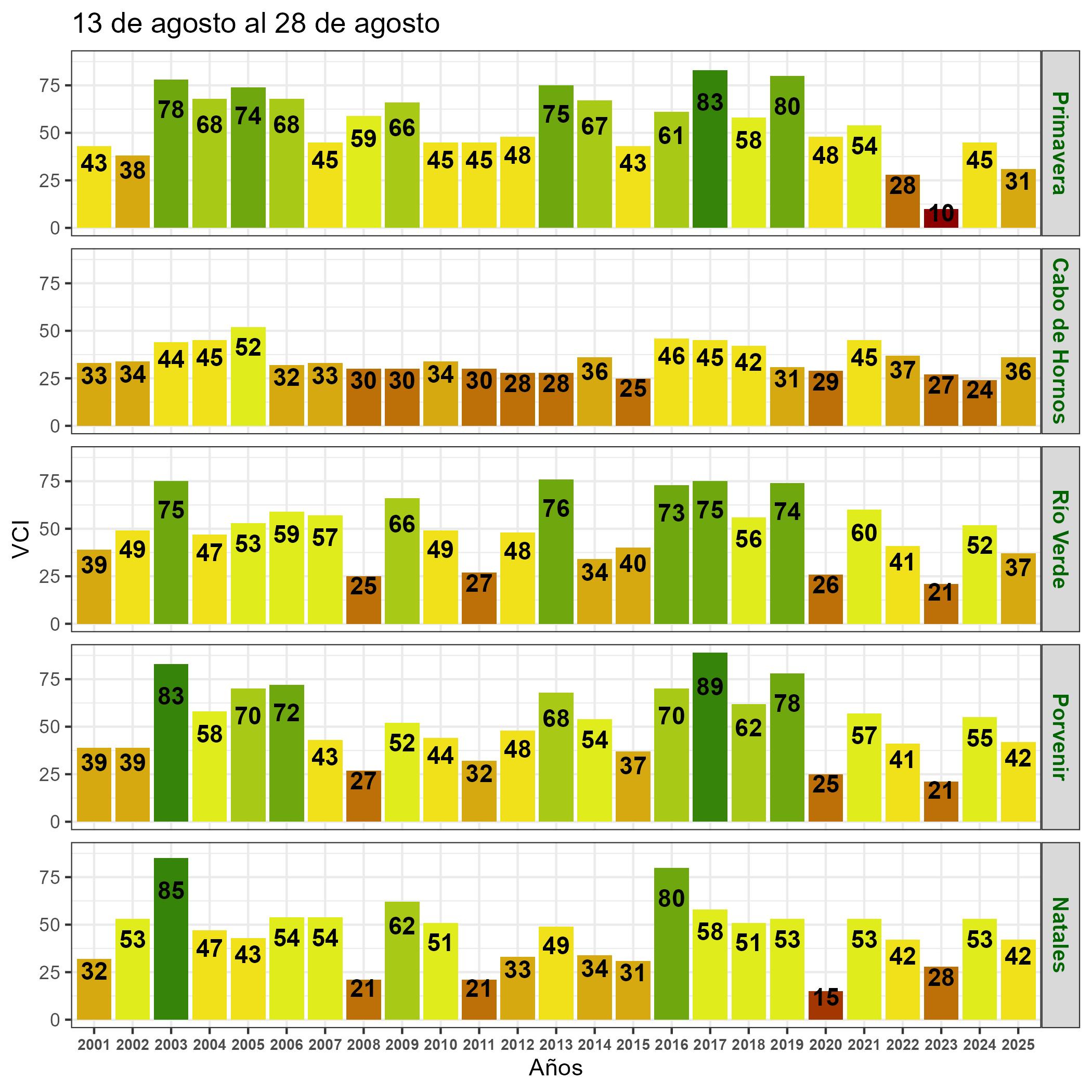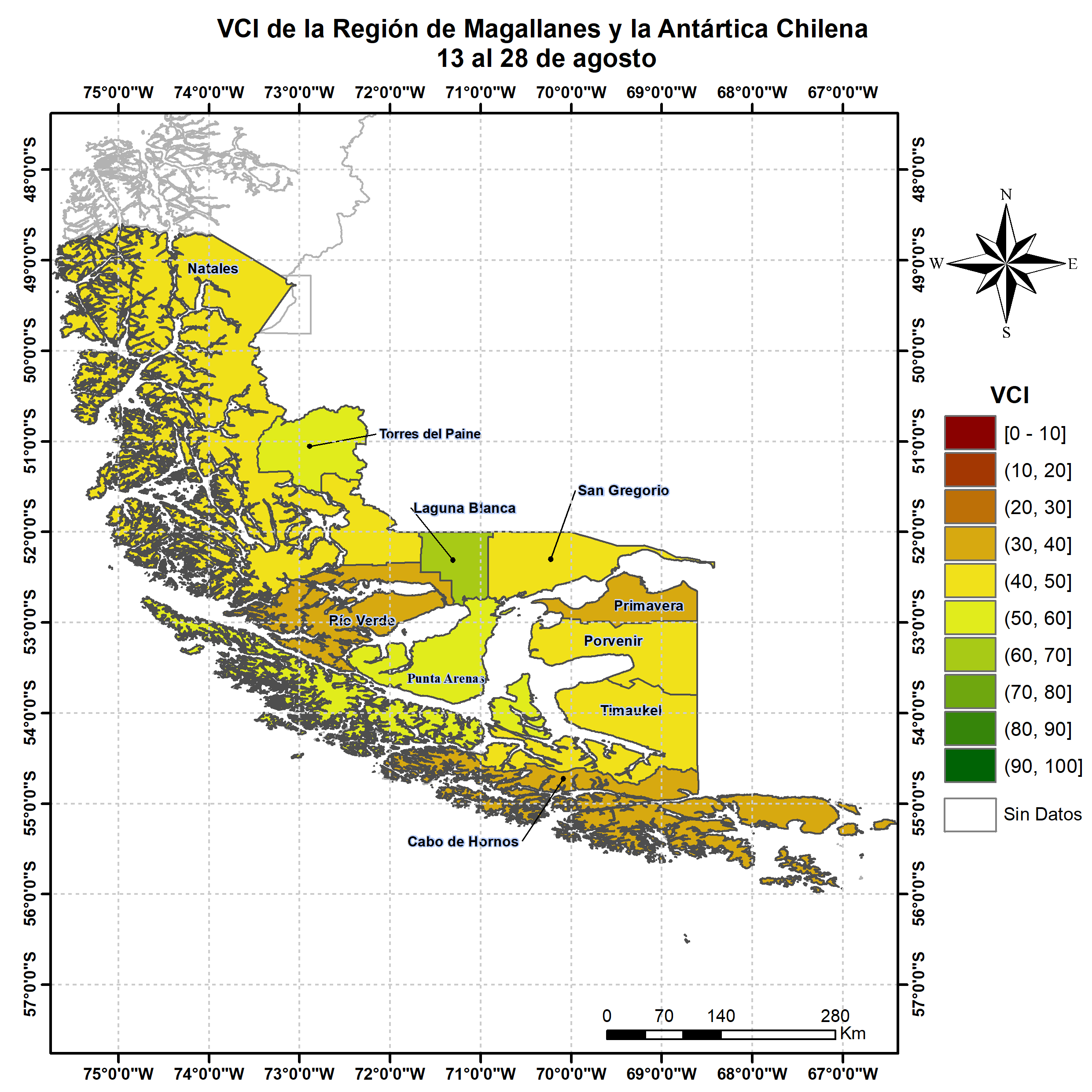 En términos globales la Región presentó un valor mediano de VCI de 46% para el período comprendido desde el 13 al 28 de agosto. A igual período del año pasado presentaba un VCI de 60% (Fig. 1). De acuerdo a la Tabla 1 la Región de Magallanes, en términos globales presenta una condición Favorable.