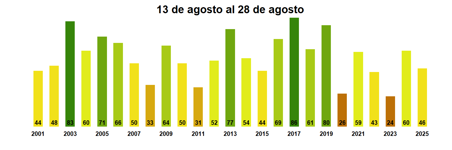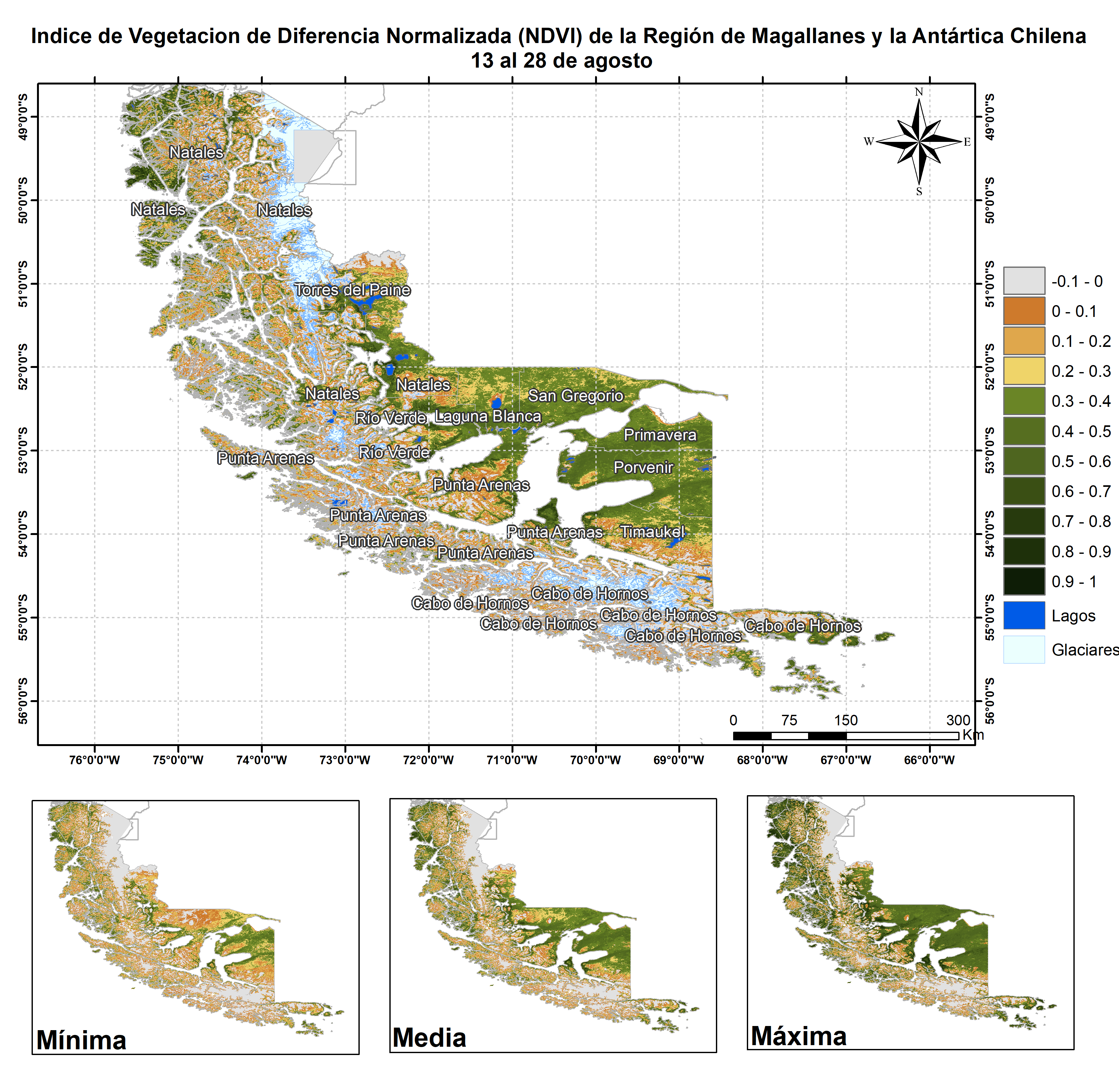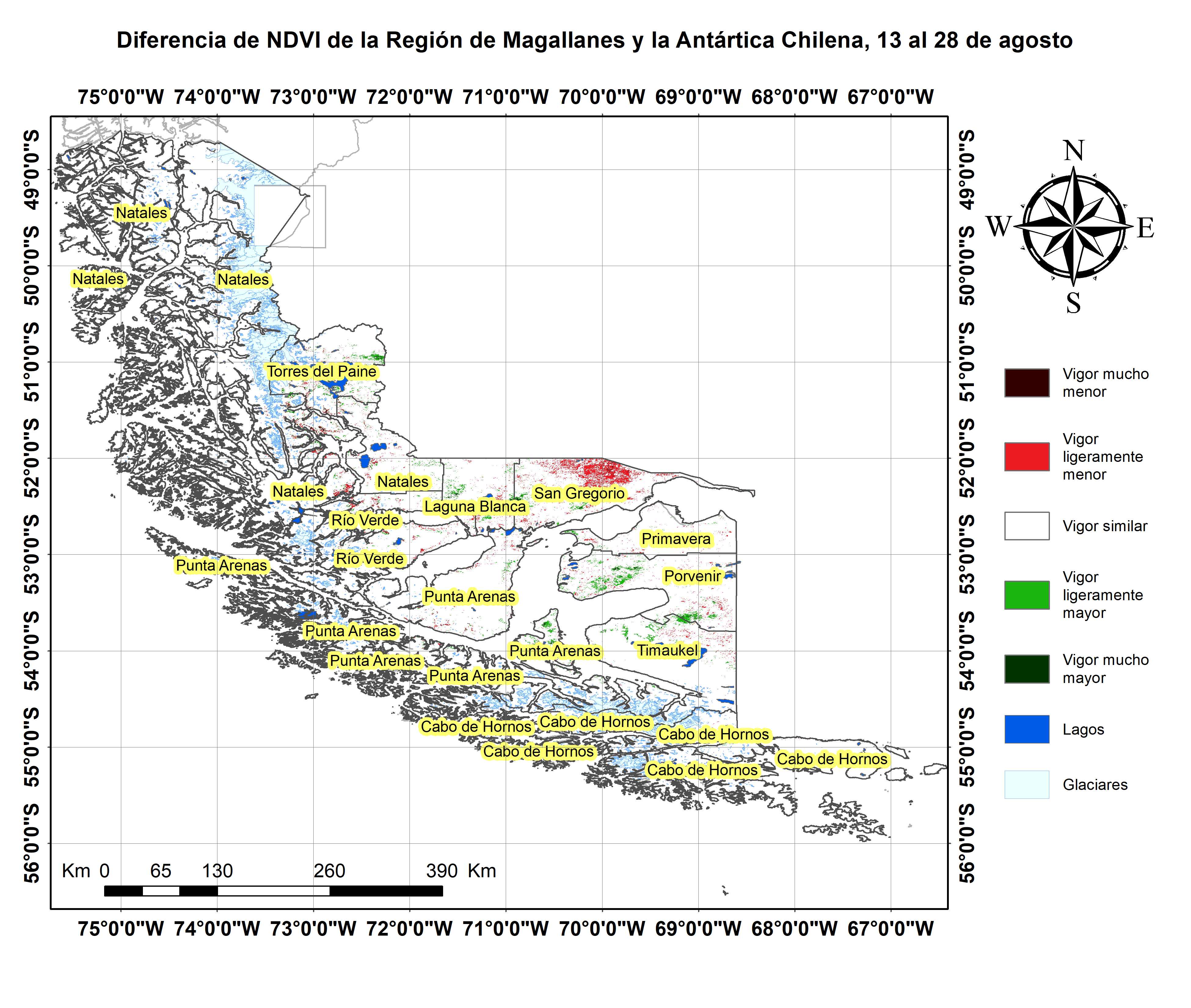 En términos globales la Región presentó un valor mediano de VCI de 46% para el período comprendido desde el 13 al 28 de agosto. A igual período del año pasado presentaba un VCI de 60% (Fig. 1). De acuerdo a la Tabla 1 la Región de Magallanes, en términos globales presenta una condición Favorable.