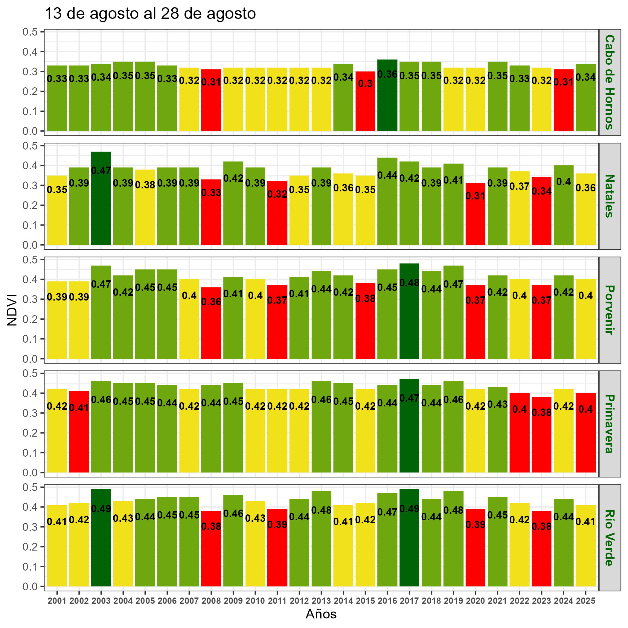 Respecto de la respuesta fisiológica de las plantas al efecto del clima, las imágenes satelitales reflejan la magnitud del crecimiento o disminución de la cobertura vegetal en esta época del año mediante el índice de vegetación NDVI (Desviación Normalizada del Índice de Vegetación).