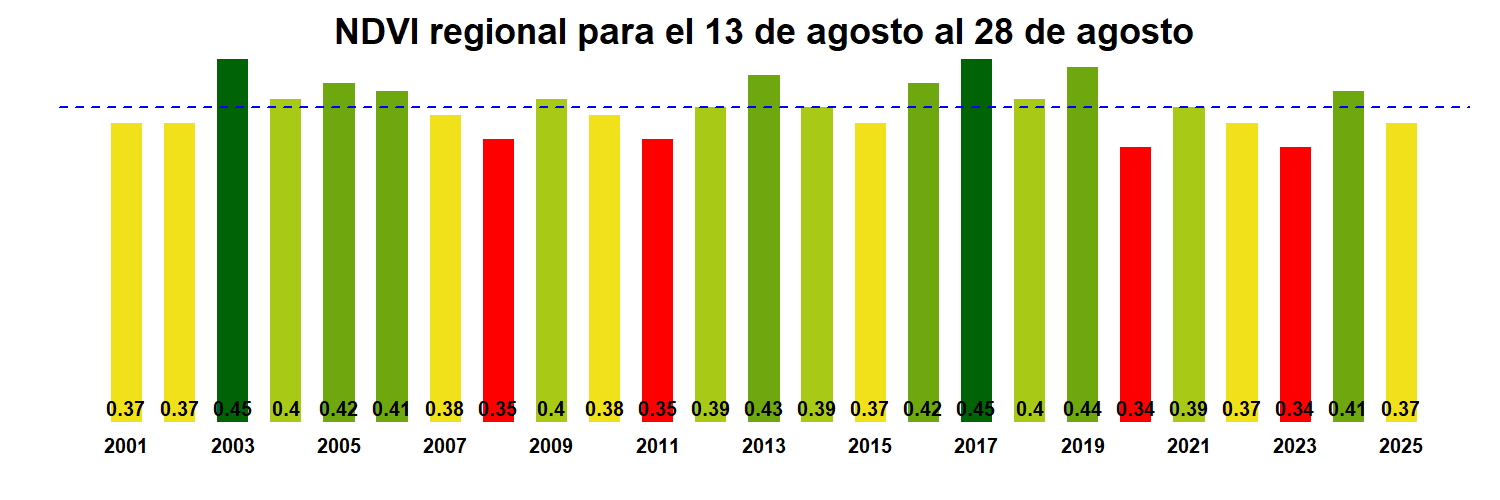 Para esta quincena se observa un NDVI promedio regional de 0.37 mientras el año pasado había sido de 0.41. El valor promedio histórico para esta región, en este período del año es de 0.39.
