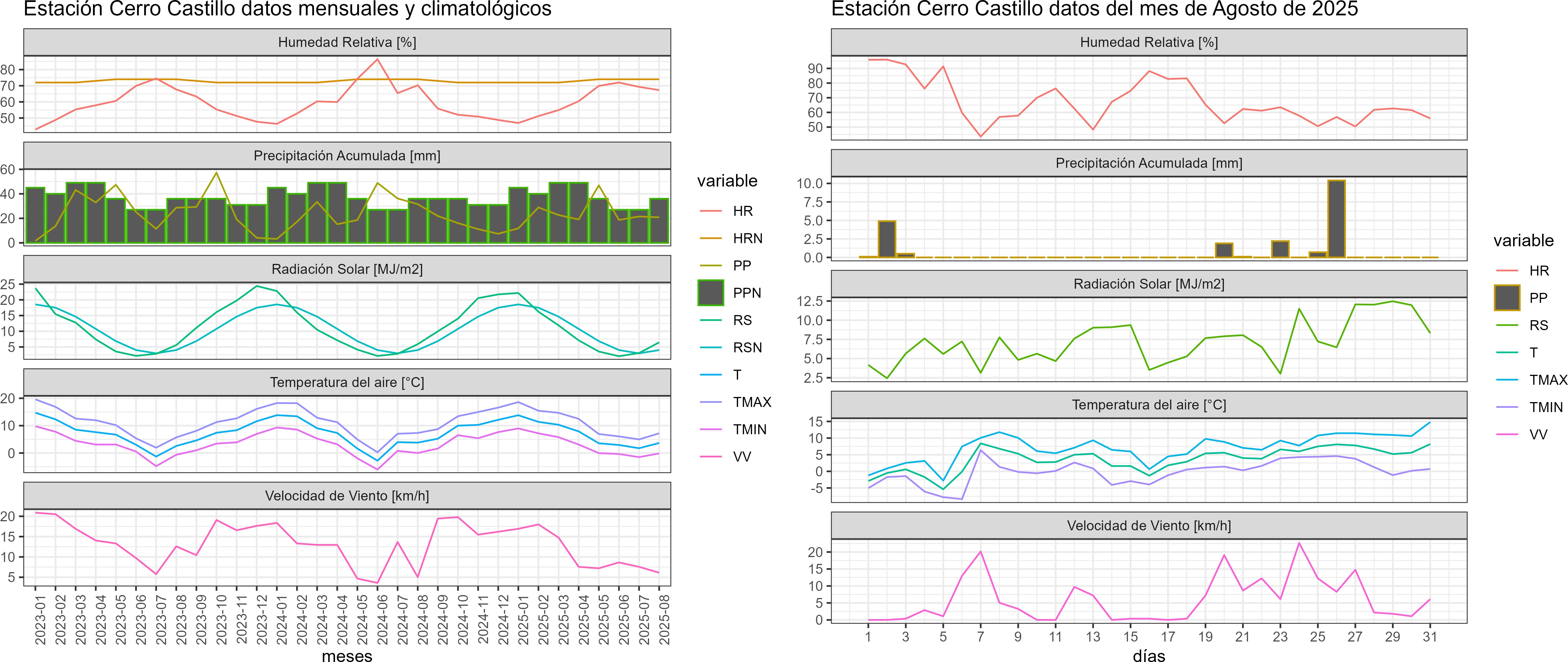La estación Cerro Castillo corresponde al distrito agroclimático 12-4. Para este distrito climático la temperatura mínima, media y máxima climatológicas alcanzan los -2.2°C, 1.8°C y 5.8°C respectivamente. Por su parte, respecto a las temperaturas medidas durante el mes de agosto en la estación: la temperatura mínima alcanzo los -0.2°C (2°C sobre la climatológica), la temperatura media 3.7°C (1.9°C sobre la climatológica) y la temperatura máxima llegó a los 7.2°C (1.4°C sobre la climatológica). En el mes de agosto se registró una pluviometría de 20.8 mm, lo cual representa un 67.1% con respecto al mismo mes de un año normal. De enero a agosto se ha registrado un total acumulado de 190.4 mm, en circunstancias que un año normal registraría a la fecha 282 mm, lo que representa un déficit de 32.5%. A la misma fecha, durante el año 2024 la precipitación alcanzaba los 31.6 mm.