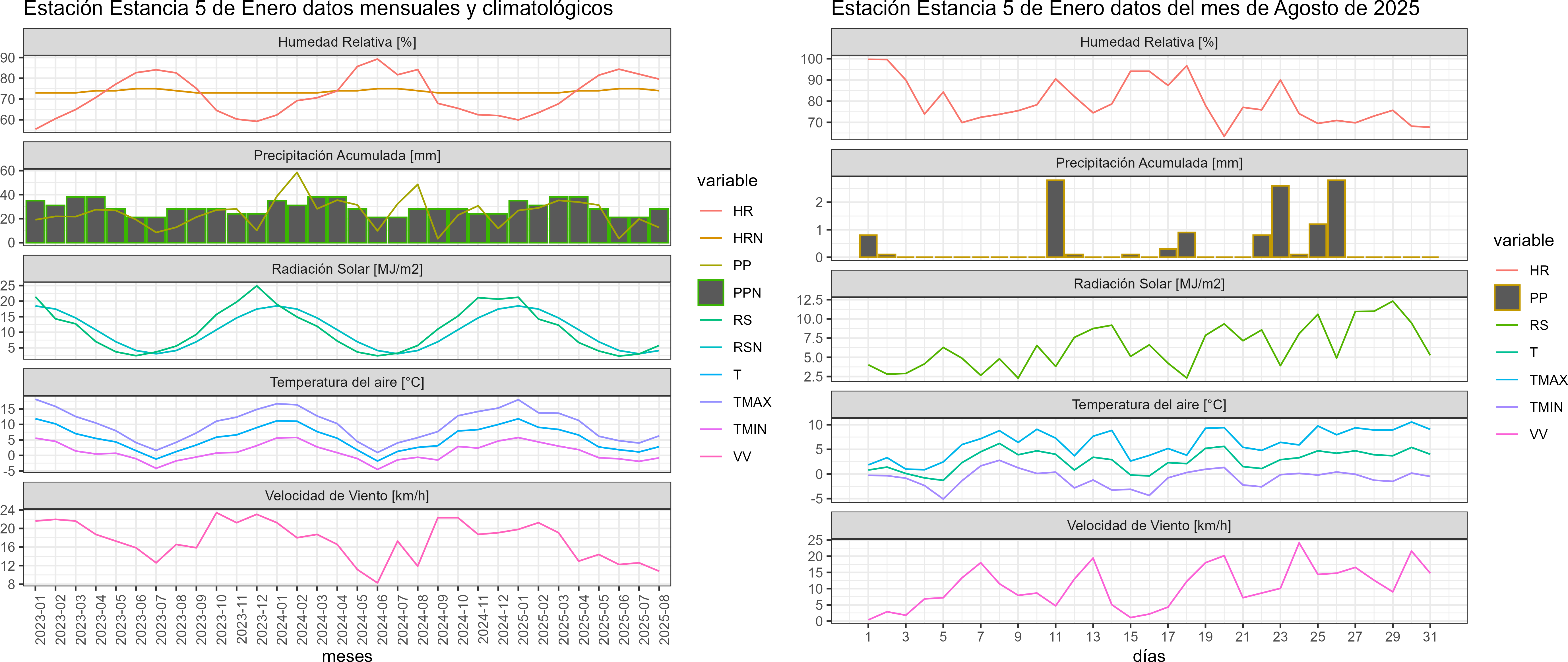 La estación Estancia 5 de Enero corresponde al distrito agroclimático 12-5. Para este distrito climático la temperatura mínima, media y máxima climatológicas alcanzan los -1.5°C, 2.2°C y 5.9°C respectivamente. Por su parte, respecto a las temperaturas medidas durante el mes de agosto en la estación: la temperatura mínima alcanzo los -0.8°C (0.7°C sobre la climatológica), la temperatura media 2.8°C (0.6°C sobre la climatológica) y la temperatura máxima llegó a los 6.3°C (0.4°C sobre la climatológica). En el mes de agosto se registró una pluviometría de 12.6 mm, lo cual representa un 50.4% con respecto al mismo mes de un año normal. De enero a agosto se ha registrado un total acumulado de 191.7 mm, en circunstancias que un año normal registraría a la fecha 249 mm, lo que representa un déficit de 23%. A la misma fecha, durante el año 2024 la precipitación alcanzaba los 48.5 mm.