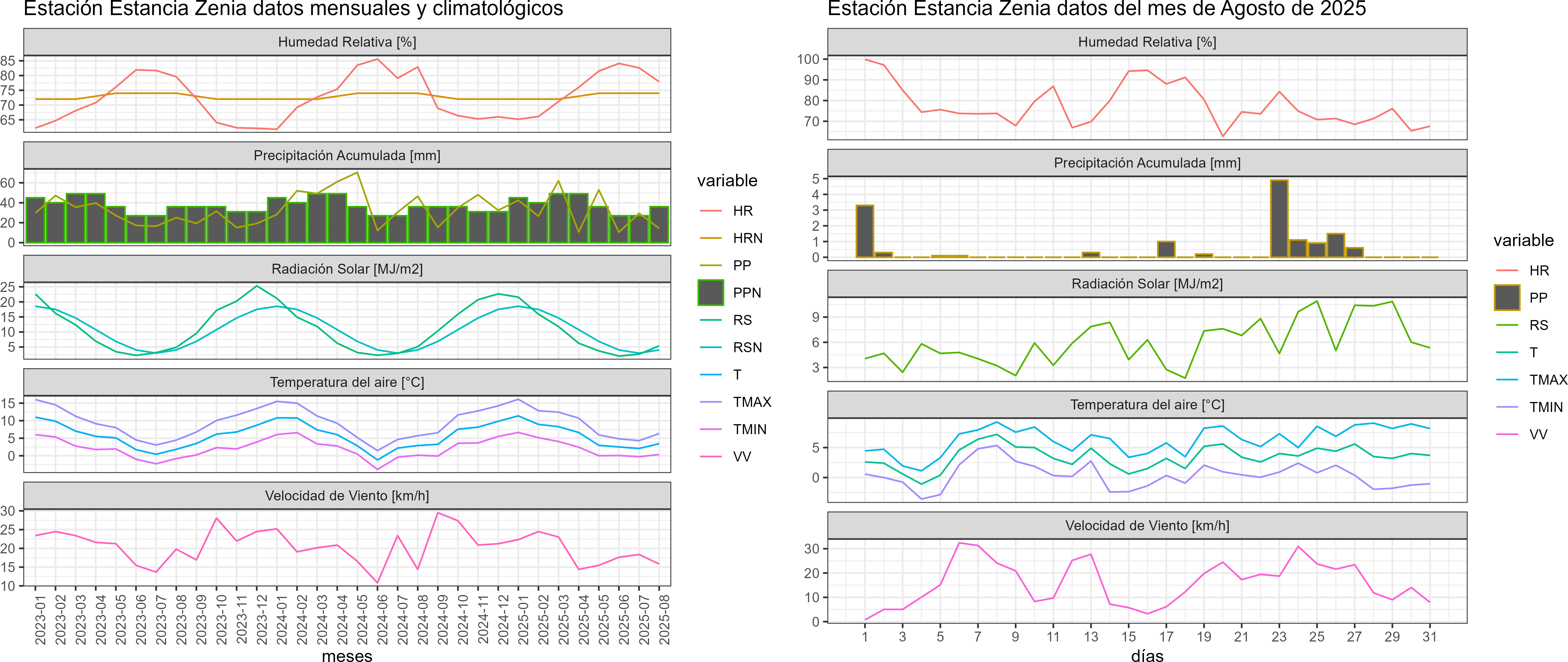 La estación Estancia Zenia corresponde al distrito agroclimático 12-4. Para este distrito climático la temperatura mínima, media y máxima climatológicas alcanzan los -1°C, 2.3°C y 5.6°C respectivamente. Por su parte, respecto a las temperaturas medidas durante el mes de agosto en la estación: la temperatura mínima alcanzo los 0.3°C (1.3°C sobre la climatológica), la temperatura media 3.4°C (1.1°C sobre la climatológica) y la temperatura máxima llegó a los 6.3°C (0.7°C sobre la climatológica). En el mes de agosto se registró una pluviometría de 14.3 mm, lo cual representa un 68.1% con respecto al mismo mes de un año normal. De enero a agosto se ha registrado un total acumulado de 248.9 mm, en circunstancias que un año normal registraría a la fecha 246 mm, lo que representa un superávit de 1.2%. A la misma fecha, durante el año 2024 la precipitación alcanzaba los 46.5 mm.