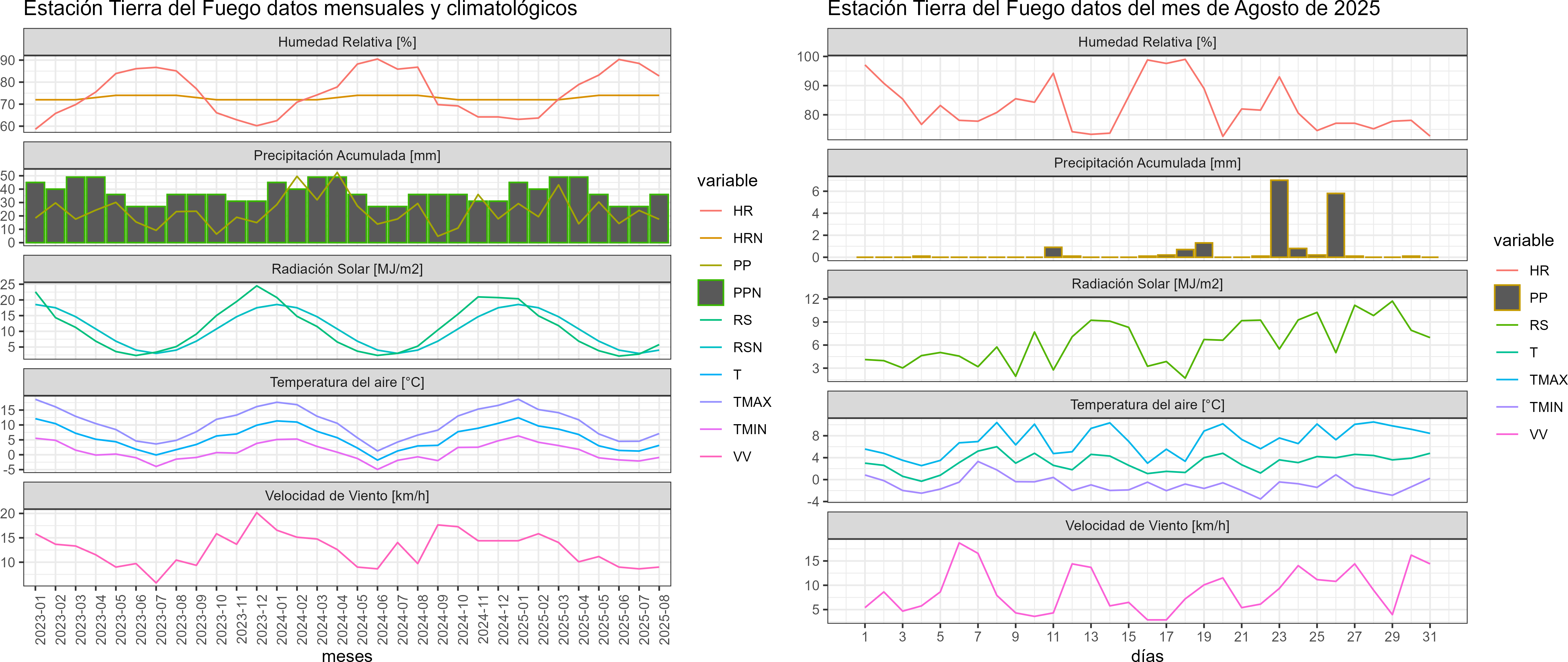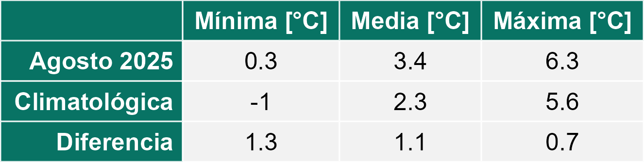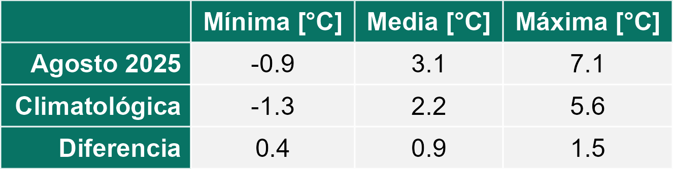La estación Tierra del Fuego corresponde al distrito agroclimático 12-4. Para este distrito climático la temperatura mínima, media y máxima climatológicas alcanzan los -1.3°C, 2.2°C y 5.6°C respectivamente. Por su parte, respecto a las temperaturas medidas durante el mes de agosto en la estación: la temperatura mínima alcanzo los -0.9°C (0.4°C sobre la climatológica), la temperatura media 3.1°C (0.9°C sobre la climatológica) y la temperatura máxima llegó a los 7.1°C (1.5°C sobre la climatológica). En el mes de agosto se registró una pluviometría de 17.5 mm, lo cual representa un 50% con respecto al mismo mes de un año normal. De enero a agosto se ha registrado un total acumulado de 192.2 mm, en circunstancias que un año normal registraría a la fecha 332 mm, lo que representa un déficit de 42.1%. A la misma fecha, durante el año 2024 la precipitación alcanzaba los 29.3 mm.
