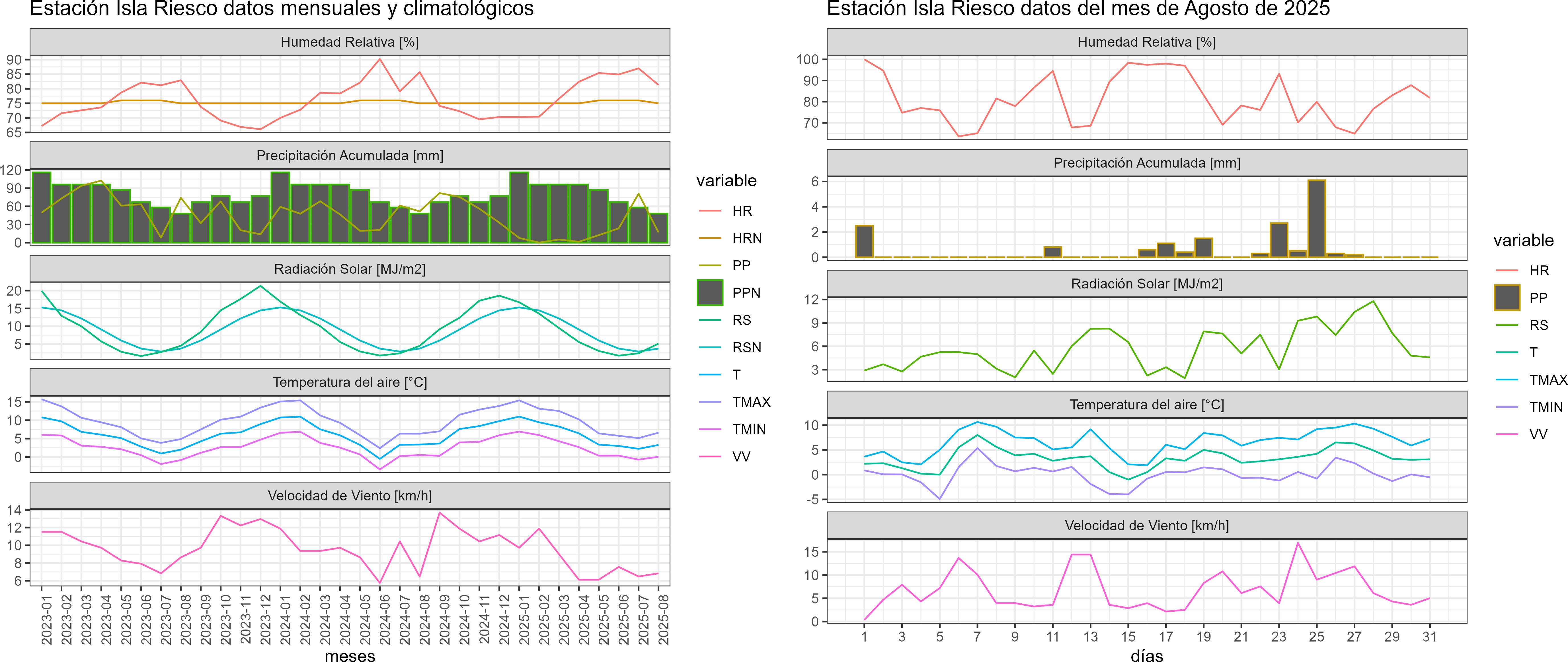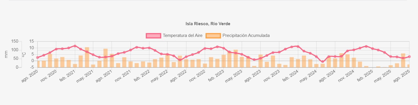 La estación Isla Riesco corresponde al distrito agroclimático 12-3. Para este distrito climático la temperatura mínima, media y máxima climatológicas alcanzan los 0.4°C, 3.2°C y 6°C respectivamente. Por su parte, respecto a las temperaturas medidas durante el mes de agosto en la estación: la temperatura mínima alcanzo los 0.1°C (-0.3°C bajo la climatológica), la temperatura media 3.3°C (0.1°C sobre la climatológica) y la temperatura máxima llegó a los 6.6°C (0.6°C sobre la climatológica). En el mes de agosto se registró una pluviometría de 17 mm, lo cual representa un 25.8% con respecto al mismo mes de un año normal. De enero a agosto se ha registrado un total acumulado de 148.5 mm, en circunstancias que un año normal registraría a la fecha 567 mm, lo que representa un déficit de 73.8%. A la misma fecha, durante el año 2024 la precipitación alcanzaba los 51.7 mm.
