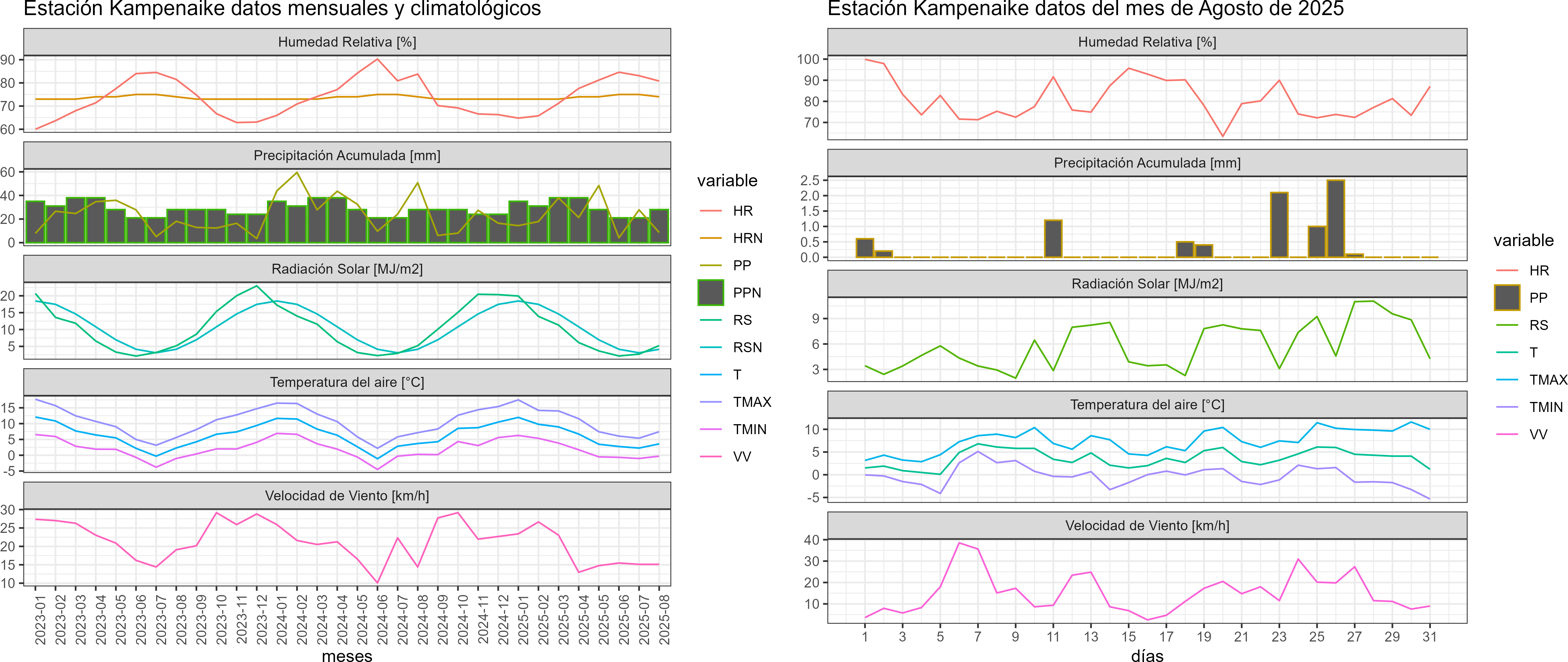 La estación Kampenaike corresponde al distrito agroclimático 12-5. Para este distrito climático la temperatura mínima, media y máxima climatológicas alcanzan los -0.9°C, 2.8°C y 6.5°C respectivamente. Por su parte, respecto a las temperaturas medidas durante el mes de agosto en la estación: la temperatura mínima alcanzo los -0.3°C (0.6°C sobre la climatológica), la temperatura media 3.6°C (0.8°C sobre la climatológica) y la temperatura máxima llegó a los 7.5°C (1°C sobre la climatológica). En el mes de agosto se registró una pluviometría de 8.6 mm, lo cual representa un 34.4% con respecto al mismo mes de un año normal. De enero a agosto se ha registrado un total acumulado de 180.4 mm, en circunstancias que un año normal registraría a la fecha 248 mm, lo que representa un déficit de 27.3%. A la misma fecha, durante el año 2024 la precipitación alcanzaba los 50.8 mm.