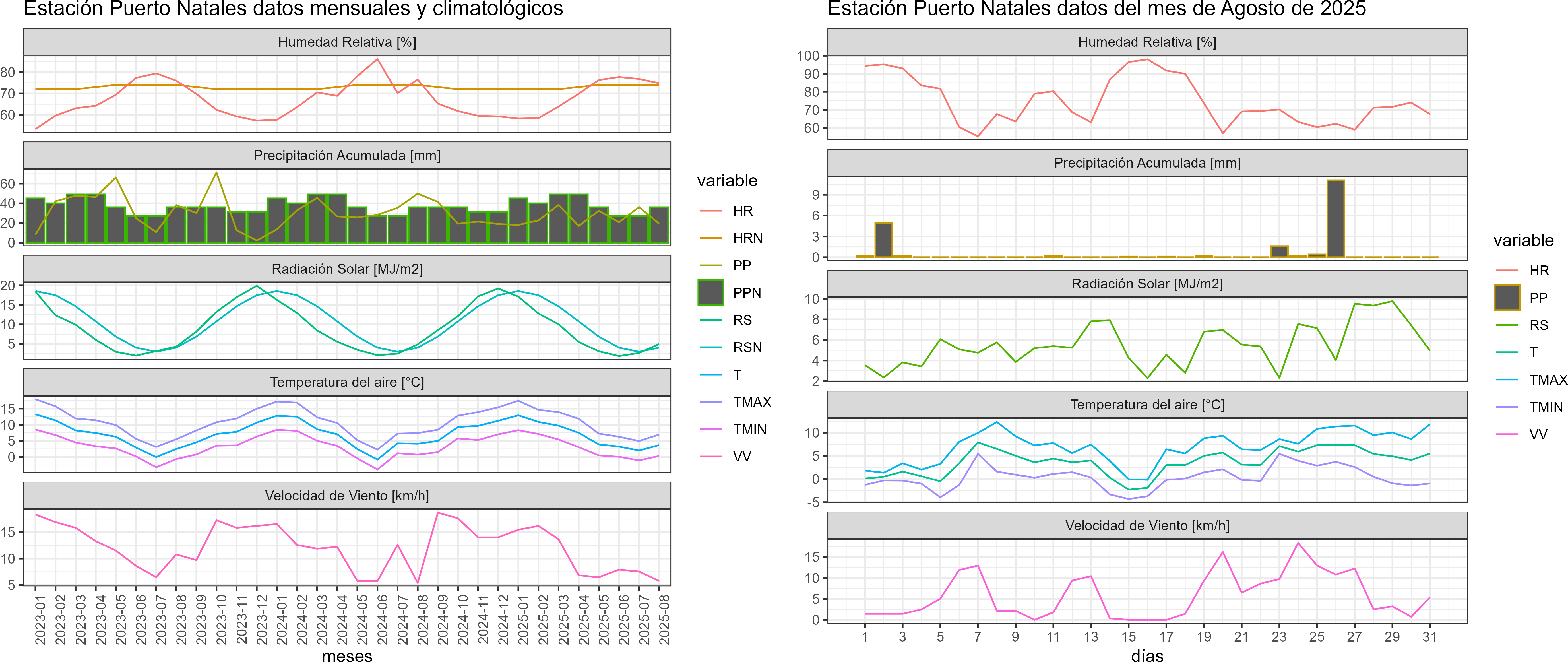 La estación Puerto Natales corresponde al distrito agroclimático 12-4. Para este distrito climático la temperatura mínima, media y máxima climatológicas alcanzan los -0.8°C, 2.5°C y 5.8°C respectivamente. Por su parte, respecto a las temperaturas medidas durante el mes de agosto en la estación: la temperatura mínima alcanzo los 0.3°C (1.1°C sobre la climatológica), la temperatura media 3.7°C (1.2°C sobre la climatológica) y la temperatura máxima llegó a los 7°C (1.2°C sobre la climatológica). En el mes de agosto se registró una pluviometría de 19.2 mm, lo cual representa un 32.5% con respecto al mismo mes de un año normal. De enero a agosto se ha registrado un total acumulado de 204.6 mm, en circunstancias que un año normal registraría a la fecha 551 mm, lo que representa un déficit de 62.9%. A la misma fecha, durante el año 2024 la precipitación alcanzaba los 49.8 mm.