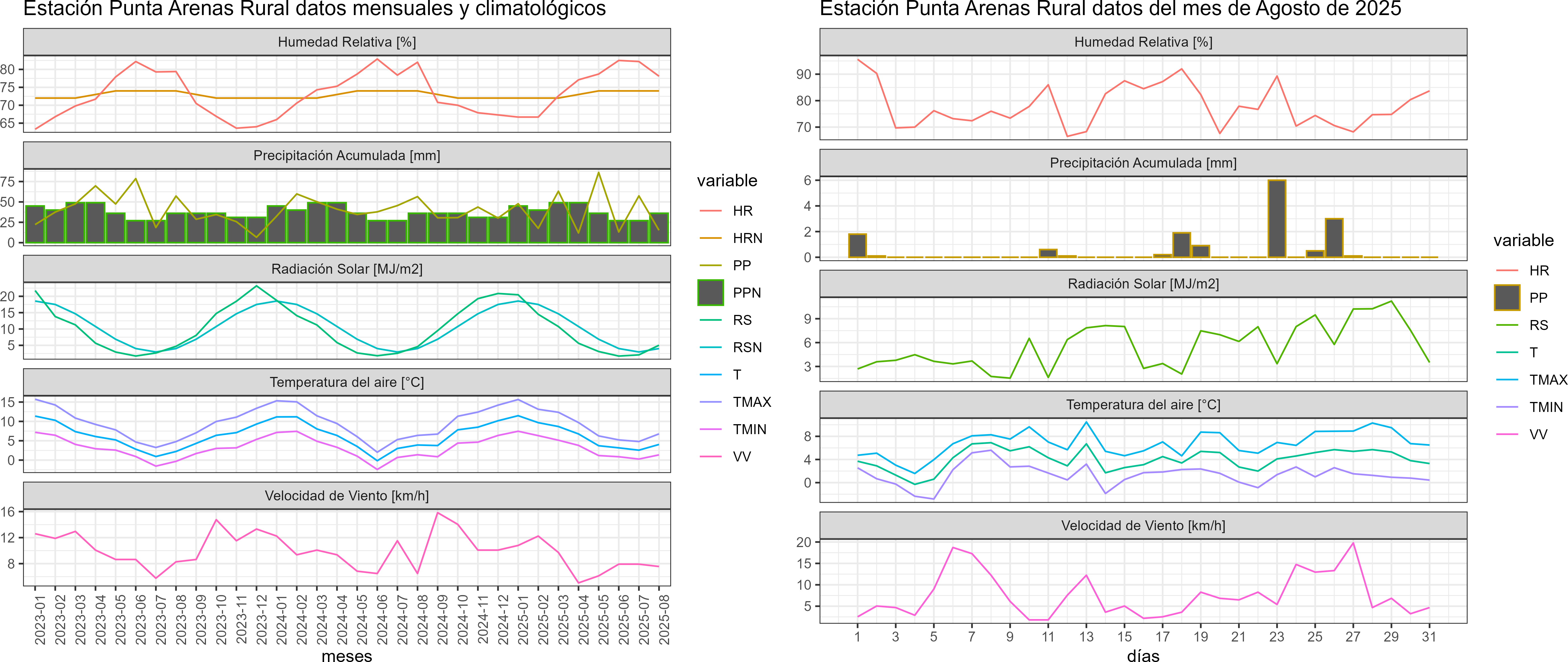 La estación Punta Arenas Rural corresponde al distrito agroclimático 12-4. Para este distrito climático la temperatura mínima, media y máxima climatológicas alcanzan los 0.2°C, 3.2°C y 6.2°C respectivamente. Por su parte, respecto a las temperaturas medidas durante el mes de agosto en la estación: la temperatura mínima alcanzo los 1.4°C (1.2°C sobre la climatológica), la temperatura media 4°C (0.8°C sobre la climatológica) y la temperatura máxima llegó a los 6.8°C (0.6°C sobre la climatológica). En el mes de agosto se registró una pluviometría de 15.2 mm, lo cual representa un 43.4% con respecto al mismo mes de un año normal. De enero a agosto se ha registrado un total acumulado de 312.3 mm, en circunstancias que un año normal registraría a la fecha 330 mm, lo que representa un déficit de 5.4%. A la misma fecha, durante el año 2024 la precipitación alcanzaba los 56.5 mm.