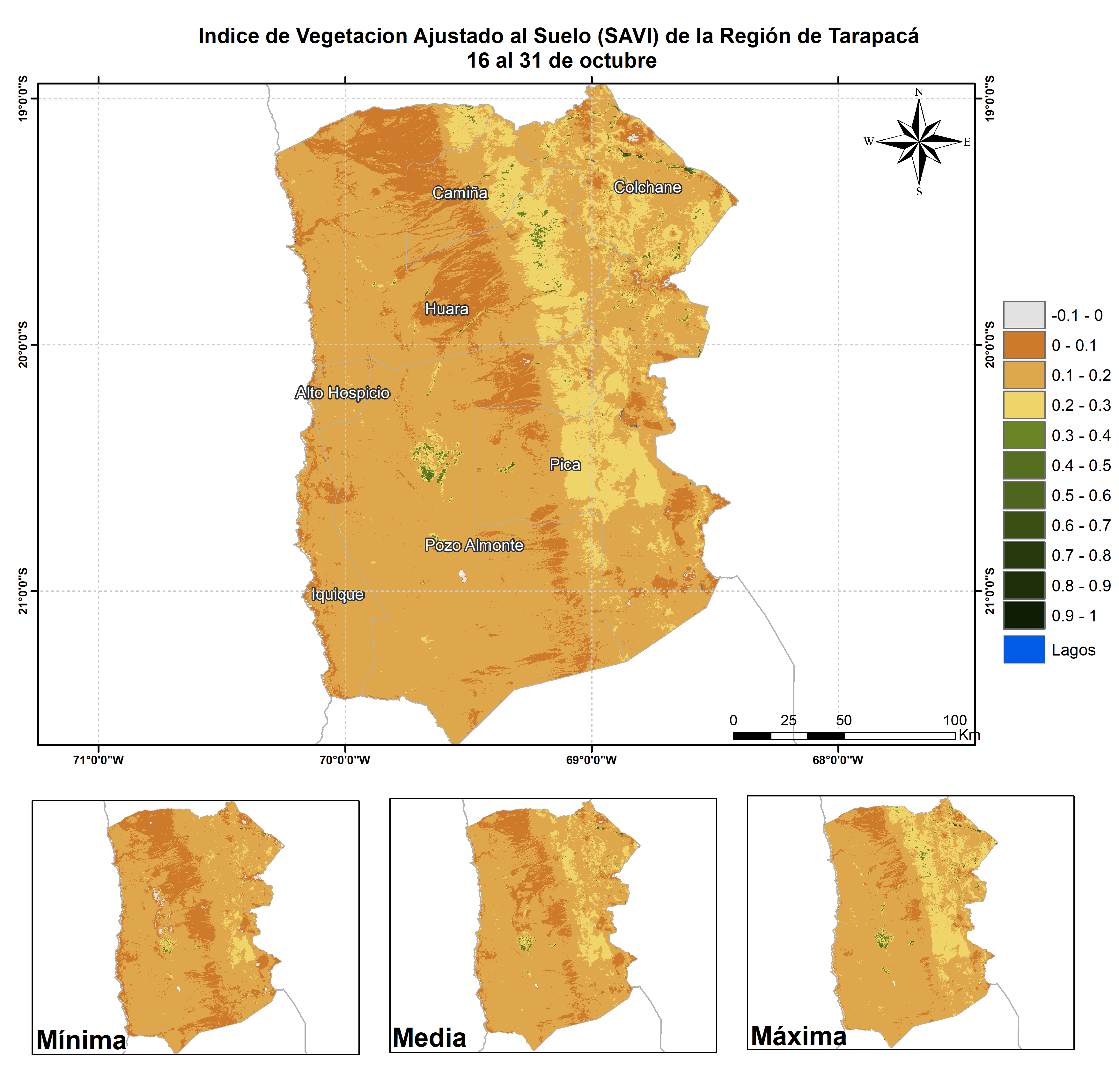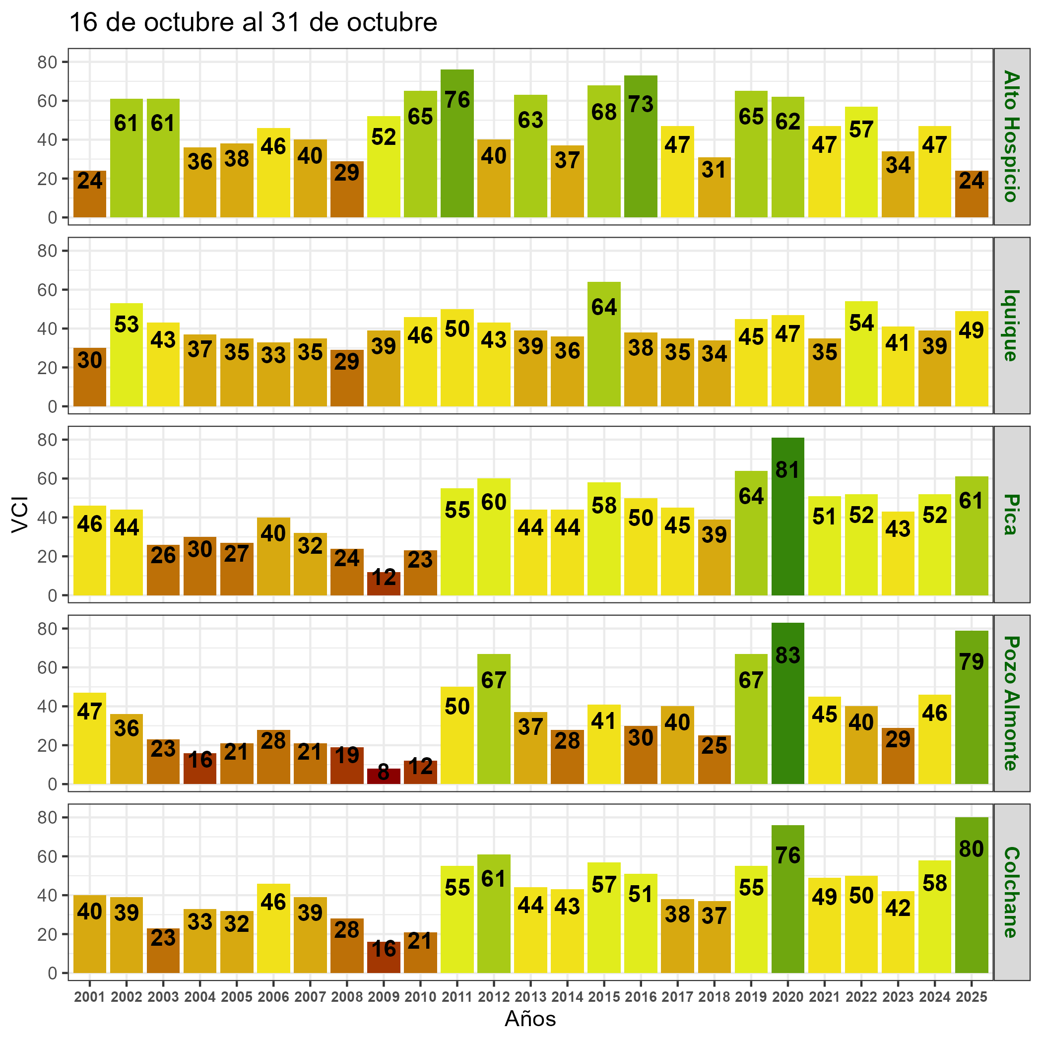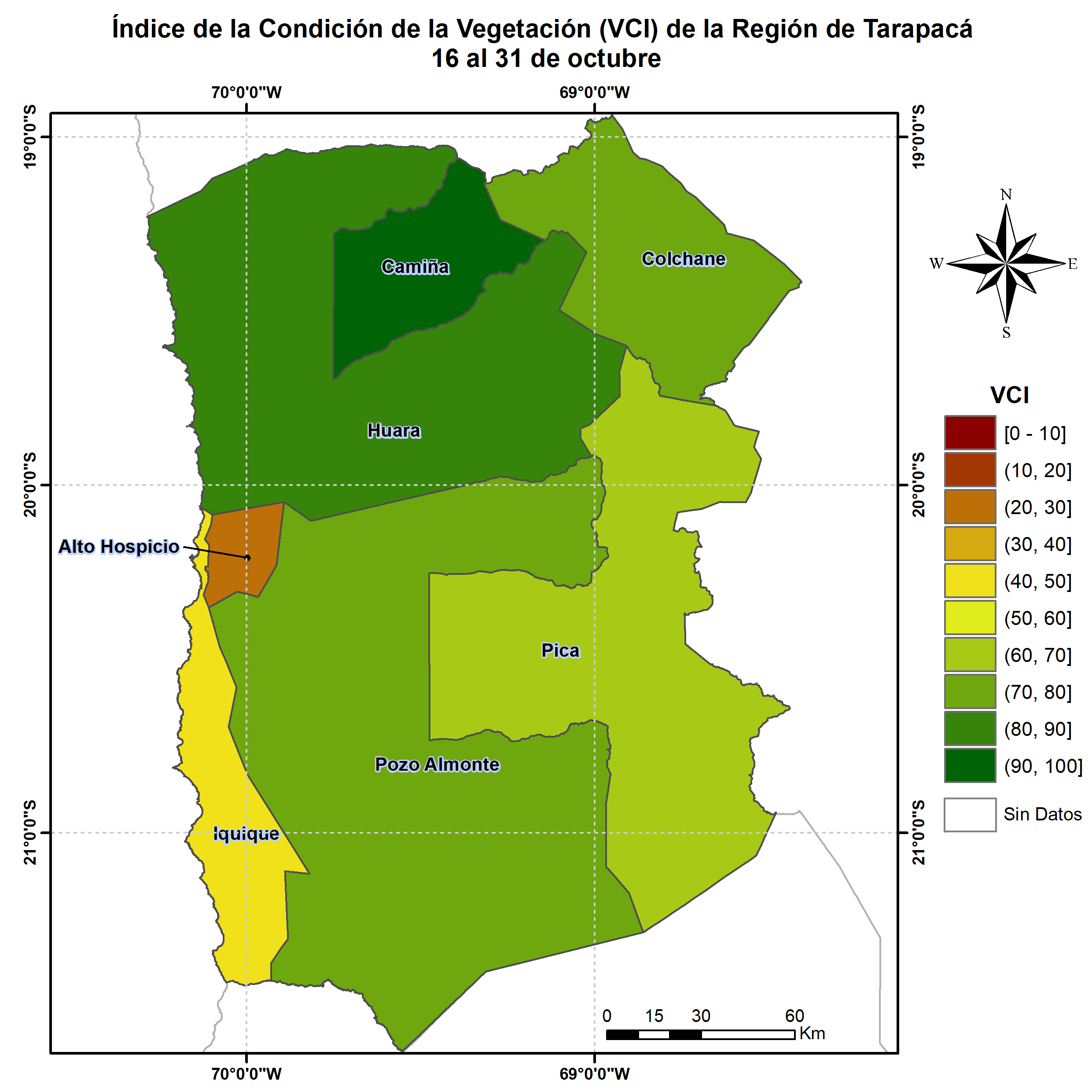 En términos globales la Región presentó un valor mediano de VCI de 74% para el período comprendido desde el 16 al 31 de octubre. A igual período del año pasado presentaba un VCI de 48% (Fig. 1). De acuerdo a la Tabla 1 la Región de Tarapacá, en términos globales presenta una condición Favorable.