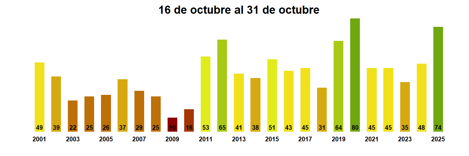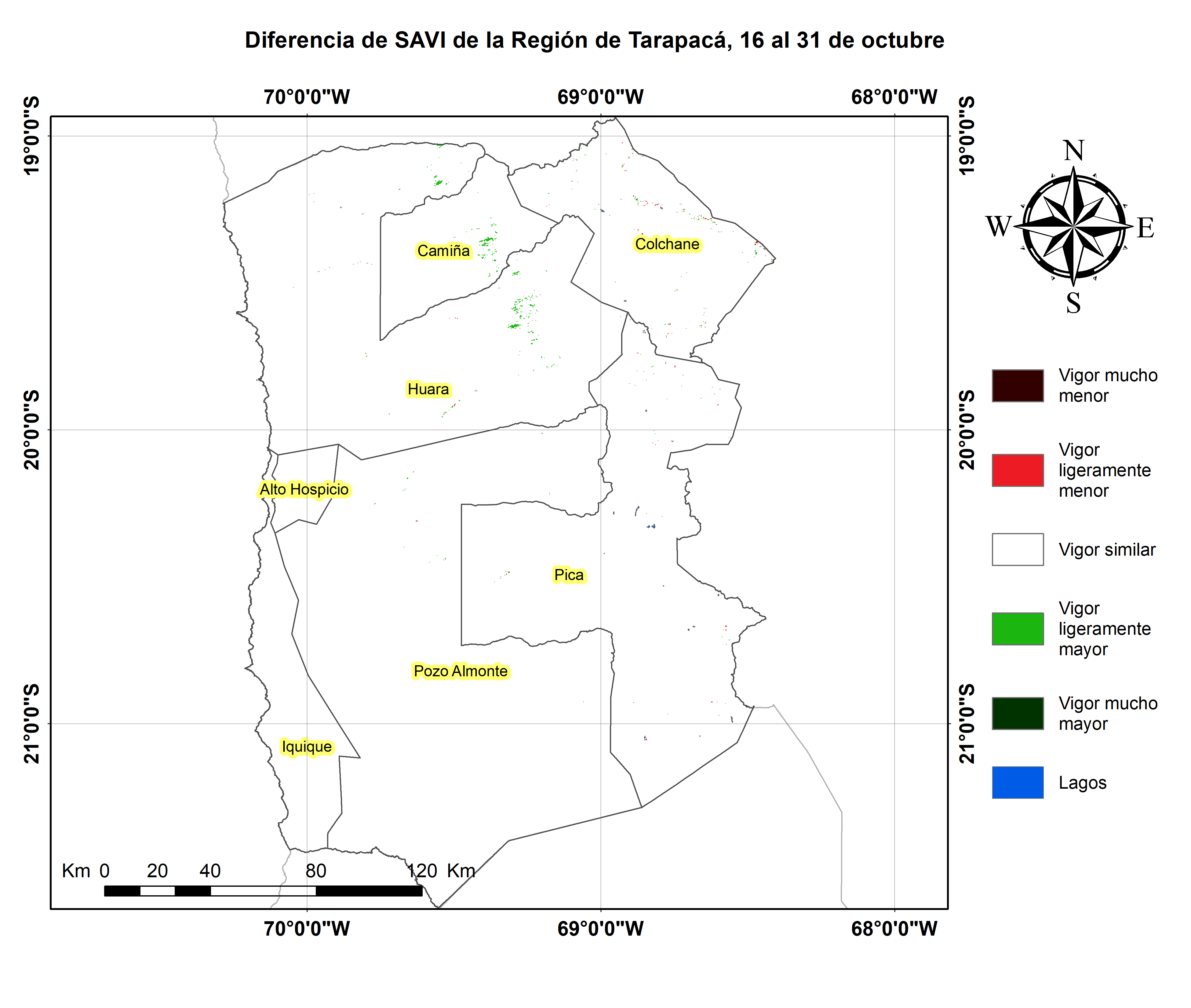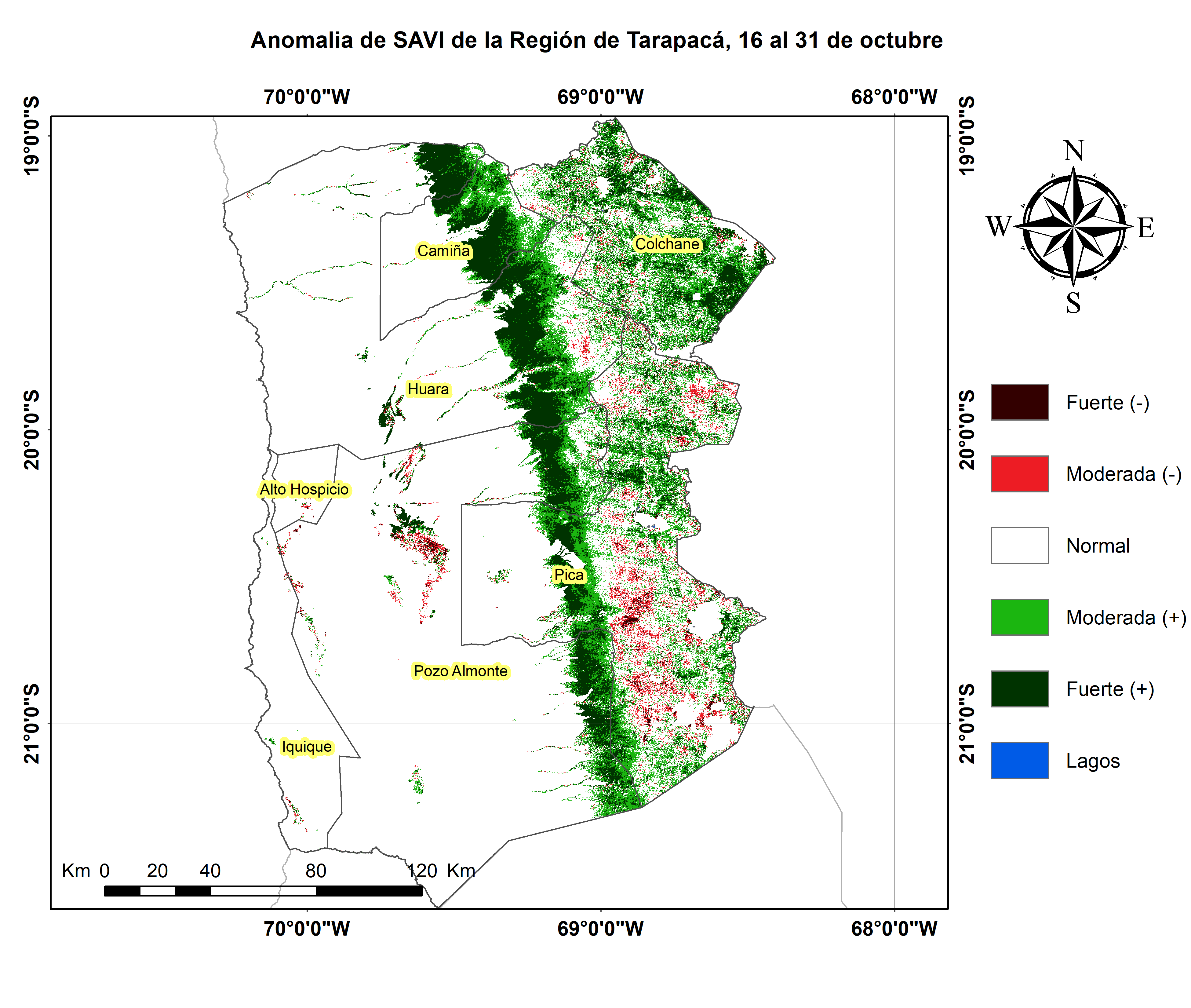 En términos globales la Región presentó un valor mediano de VCI de 74% para el período comprendido desde el 16 al 31 de octubre. A igual período del año pasado presentaba un VCI de 48% (Fig. 1). De acuerdo a la Tabla 1 la Región de Tarapacá, en términos globales presenta una condición Favorable.