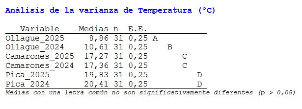Figura 3.- Comparación de temperaturas medias del mes entre años en Camarones, Pica y Ollague.
