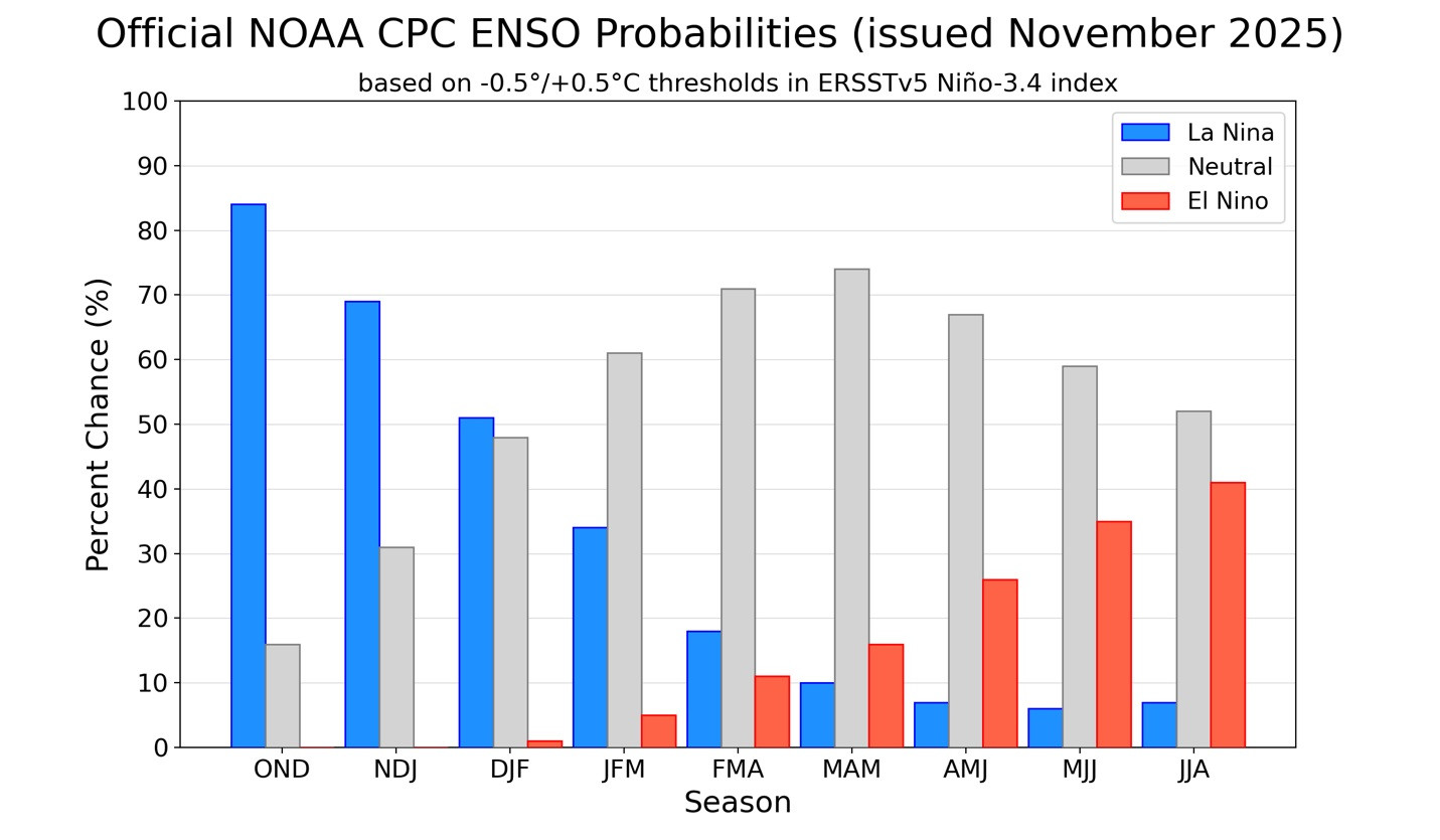 Figura 1. Las probabilidades del fenómeno ENSO indican cuáles serán las condiciones meteorológicas esperadas durante la temporada agrícola actual.