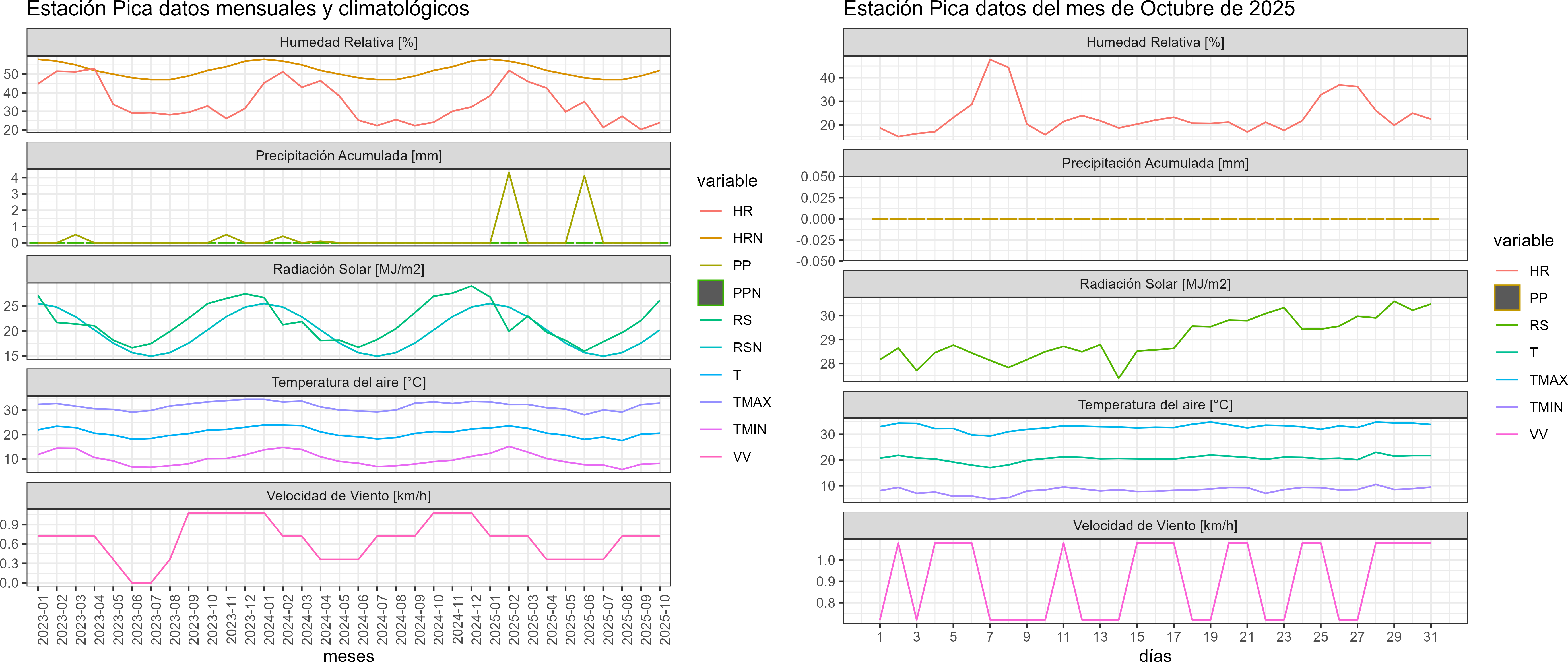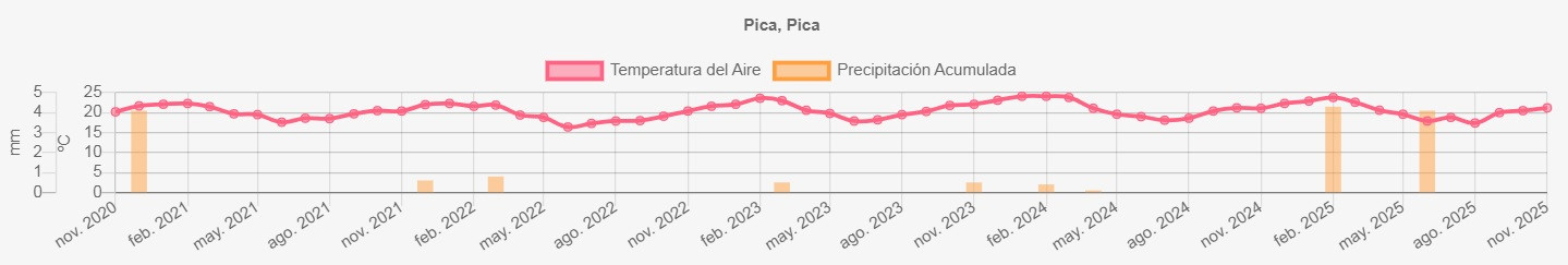 La estación Pica corresponde al distrito agroclimático 15-2-2. Para este distrito climático la temperatura mínima, media y máxima climatológicas alcanzan los 7.4°C, 19.5°C y 31.6°C respectivamente. Por su parte, respecto a las temperaturas medidas durante el mes de octubre en la estación: la temperatura mínima alcanzo los 8.1°C (0.7°C sobre la climatológica), la temperatura media 20.6°C (1.1°C sobre la climatológica) y la temperatura máxima llegó a los 32.9°C (1.3°C sobre la climatológica). En el mes de octubre se registró una pluviometría de 0 mm. De enero a octubre se ha registrado un total acumulado de 8.4 mm, en circunstancias que un año normal registraría a la fecha 7 mm, lo que representa un superávit de 20%. A la misma fecha, durante el año 2024 la precipitación alcanzaba los 0 mm.