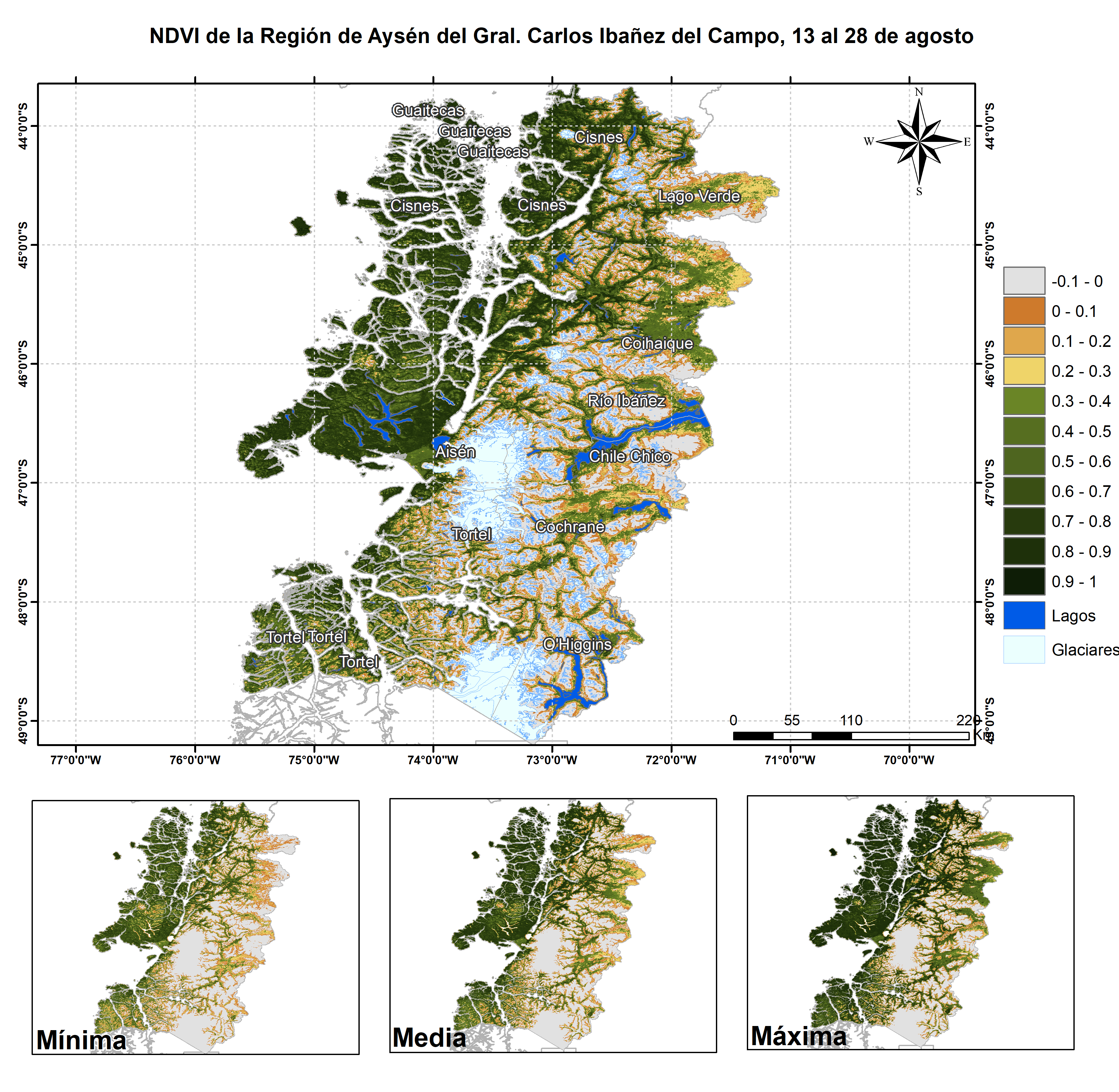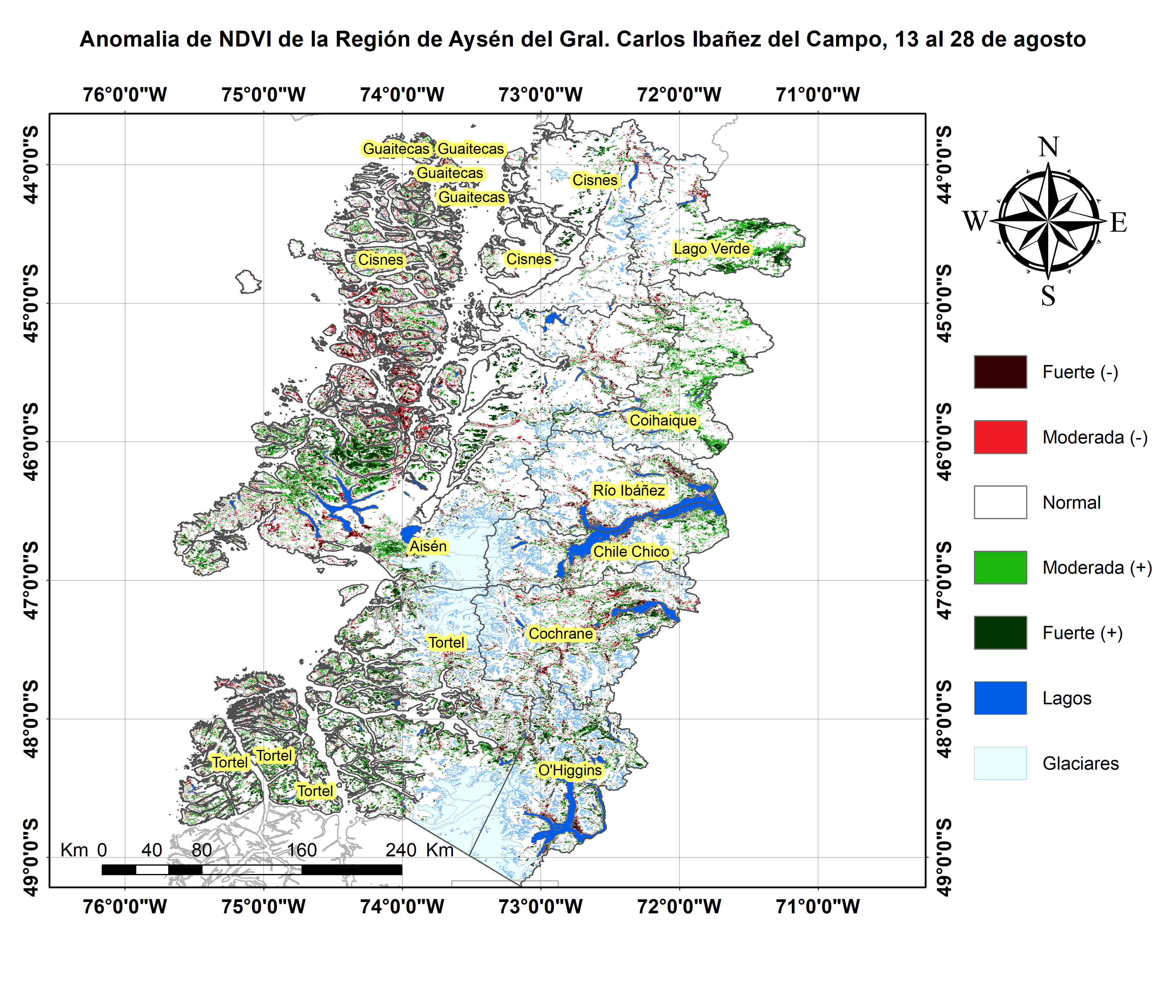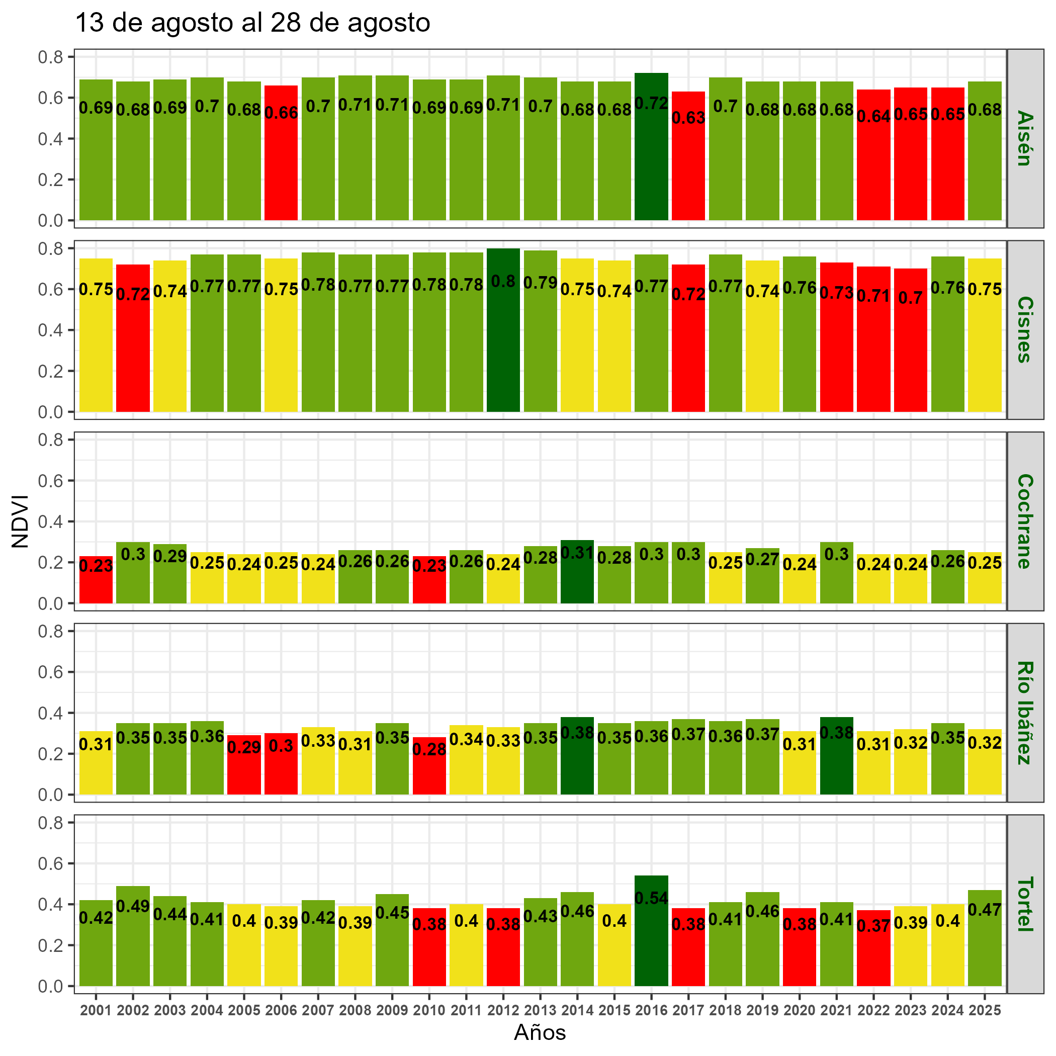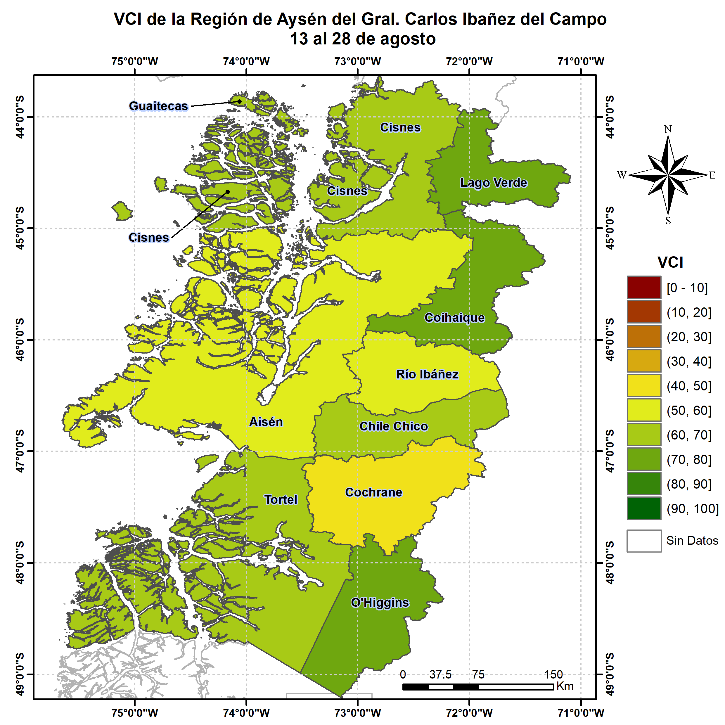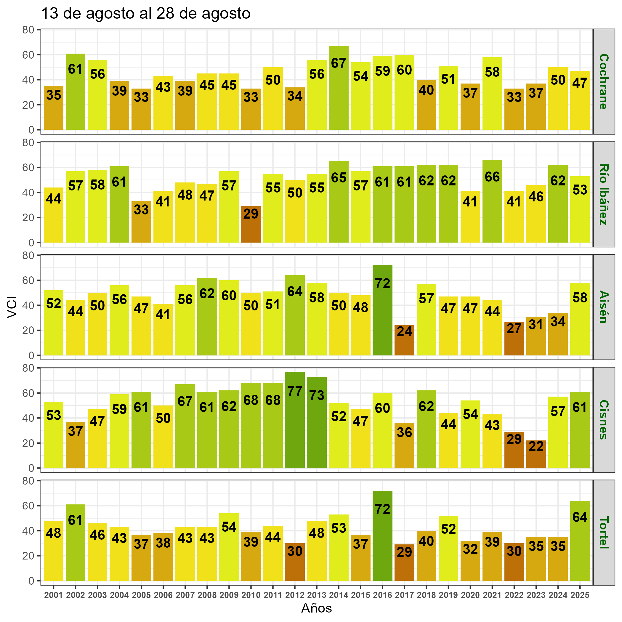 En términos globales la Región presentó un valor mediano de VCI de 63% para el período comprendido desde el 13 al 28 de agosto. A igual período del año pasado presentaba un VCI de 46% (Fig. 1). De acuerdo a la Tabla 1 la Región de Aysén, en términos globales presenta una condición Favorable.