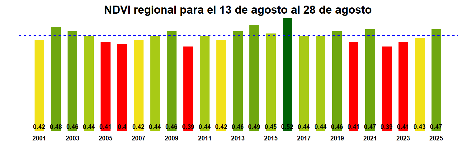 Para esta quincena se observa un NDVI promedio regional de 0.47 mientras el año pasado había sido de 0.43. El valor promedio histórico para esta región, en este período del año es de 0.44.