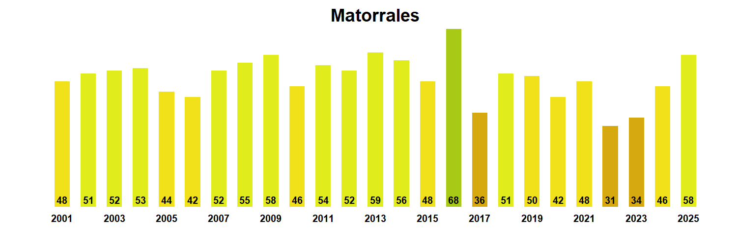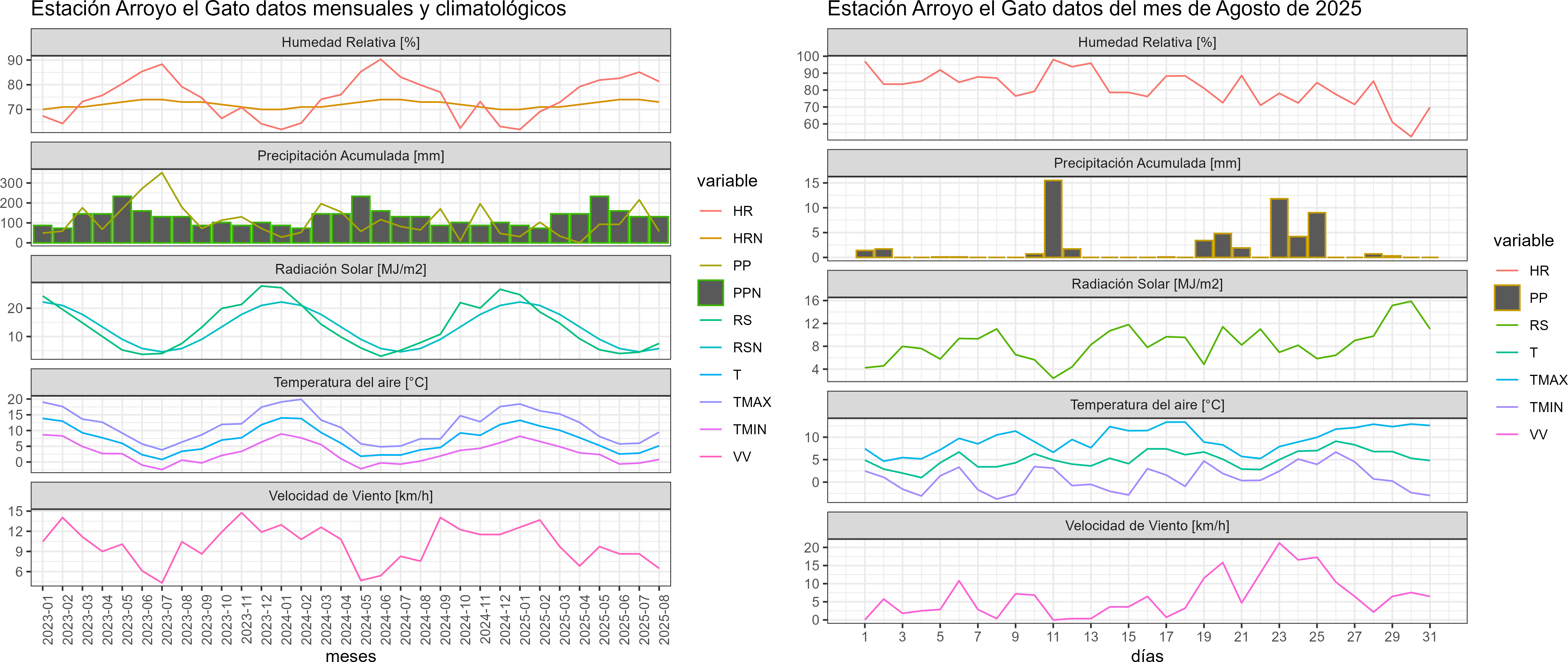 La estación Arroyo el Gato corresponde al distrito agroclimático 11-12-9. Para este distrito climático la temperatura mínima, media y máxima climatológicas alcanzan los -0.9°C, 2.8°C y 6.6°C respectivamente. Por su parte, respecto a las temperaturas medidas durante el mes de agosto en la estación: la temperatura mínima alcanzo los 0.8°C (1.7°C sobre la climatológica), la temperatura media 5.1°C (2.3°C sobre la climatológica) y la temperatura máxima llegó a los 9.5°C (2.9°C sobre la climatológica). Sumado a lo anterior, se registraron diez eventos de heladas, con una temperatura mínima absoluta de -3,8°C. En el mes de agosto se registró una pluviometría de 57.4 mm, lo cual representa un 43.2% con respecto al mismo mes de un año normal. De enero a agosto se ha registrado un total acumulado de 627.1 mm, en circunstancias que un año normal registraría a la fecha 769 mm, lo que representa un déficit de 18.5%. A la misma fecha, durante el año 2024 la precipitación alcanzaba los 64.6 mm.