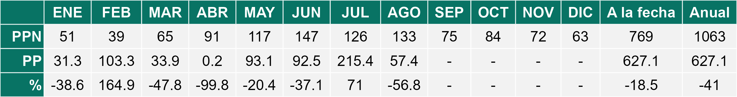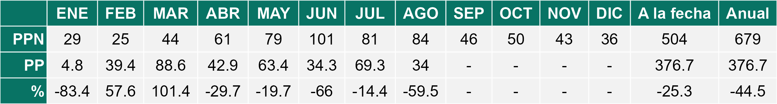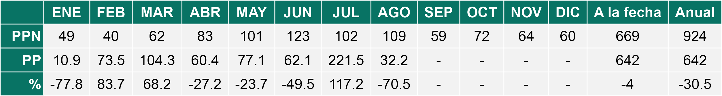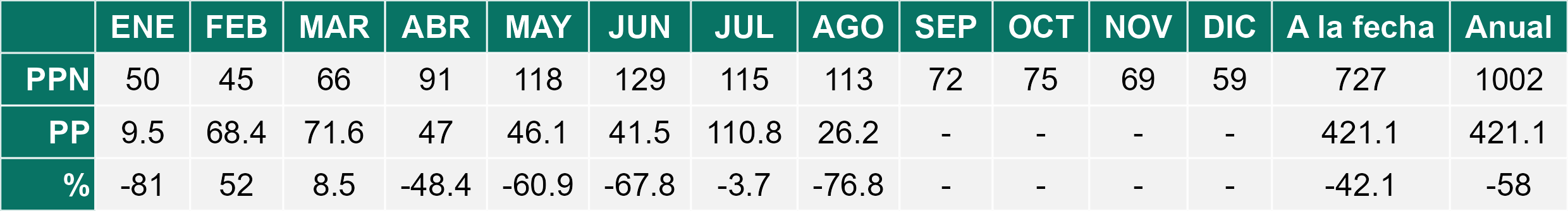 Durante agosto, la Estepa registró un promedio de 30,6 mm de precipitación, un 50% menos que el histórico de 61 mm. En Balmaceda se observaron 27,2 mm y en Ñirehuao 34 mm. Las temperaturas fueron superiores a lo normal, con una media de 4,4°C (vs 2,0°C), destacando el alza de las mínimas (–0,5°C vs –1,1°C) y máximas (9,1°C vs 6,4°C). Si bien las condiciones térmicas fueron más favorables, el crecimiento de praderas sigue siendo mínimo en esta etapa invernal. Por ello, es clave planificar el uso de forraje conservado para el final del invierno e inicio de primavera, resguardando la condición corporal del ganado en pariciones. Además, se recomienda cuidar las praderas destinadas a corte, considerando que las lluvias acumuladas durante el año han sido limitadas.