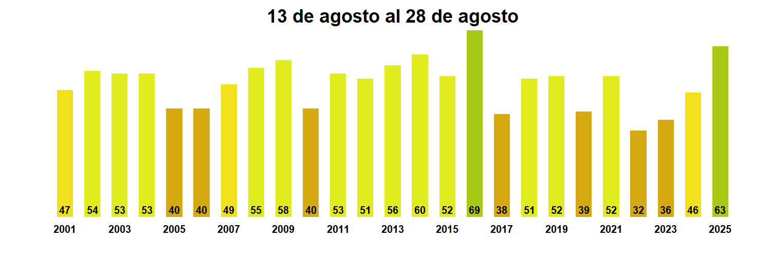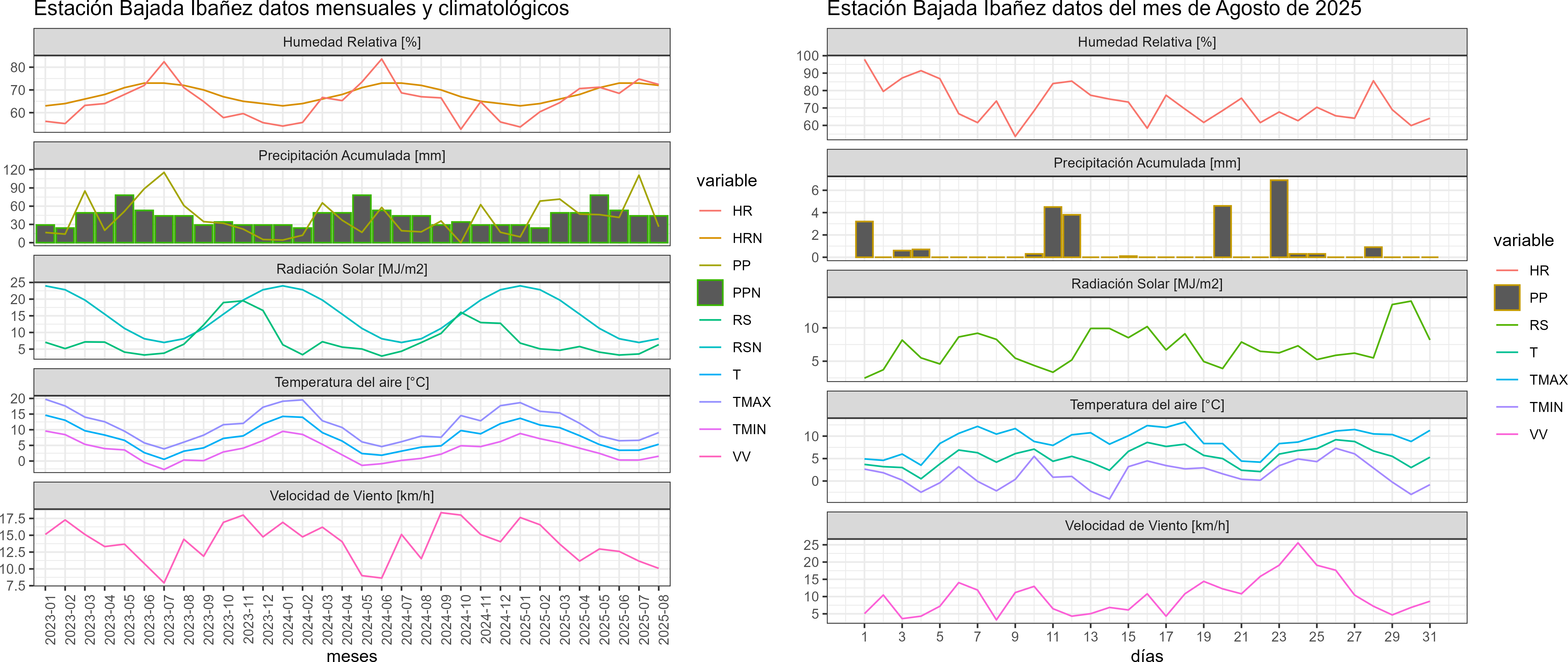 La estación Bajada Ibañez corresponde al distrito agroclimático 11-4. Para este distrito climático la temperatura mínima, media y máxima climatológicas alcanzan los -0.8°C, 2.6°C y 6°C respectivamente. Por su parte, respecto a las temperaturas medidas durante el mes de agosto en la estación: la temperatura mínima alcanzo los 1.5°C (2.3°C sobre la climatológica), la temperatura media 5.4°C (2.8°C sobre la climatológica) y la temperatura máxima llegó a los 9.1°C (3.1°C sobre la climatológica). En este sector, se registraron siete eventos de heladas, con una temperatura mínima absoluta de -4°C. En el mes de agosto se registró una pluviometría de 26.2 mm, lo cual representa un 23.2% con respecto al mismo mes de un año normal. De enero a agosto se ha registrado un total acumulado de 421.1 mm, en circunstancias que un año normal registraría a la fecha 727 mm, lo que representa un déficit de 42.1%. A la misma fecha, durante el año 2024 la precipitación alcanzaba los 17.8 mm.