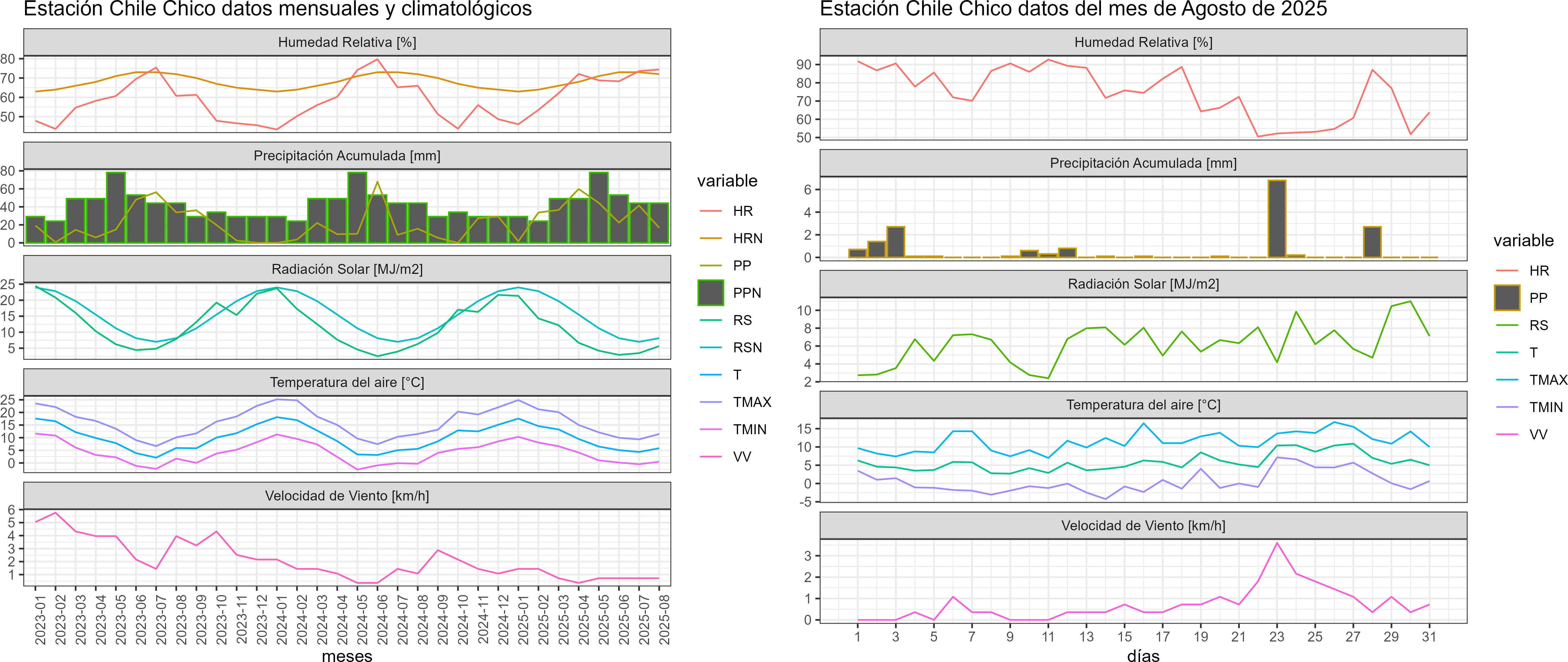 La estación Chile Chico corresponde al distrito agroclimático 11-4. Para este distrito climático la temperatura mínima, media y máxima climatológicas alcanzan los 1.4°C, 5.9°C y 10.5°C respectivamente. Por su parte, respecto a las temperaturas medidas durante el mes de agosto en la estación: la temperatura mínima alcanzo los 0.5°C (-0.9°C bajo la climatológica), la temperatura media 5.8°C (-0.1°C bajo la climatológica) y la temperatura máxima llegó a los 11.4°C (0.9°C sobre la climatológica). En esta localidad se registraron quince eventos de heladas, con una temperatura mínima absoluta de -4,3°C. En el mes de agosto se registró una pluviometría de 16.8 mm, lo cual representa un 57.9% con respecto al mismo mes de un año normal. De enero a agosto se ha registrado un total acumulado de 256.9 mm, en circunstancias que un año normal registraría a la fecha 206 mm, lo que representa un superávit de 24.7%. A la misma fecha, durante el año 2024 la precipitación alcanzaba los 15.7 mm.