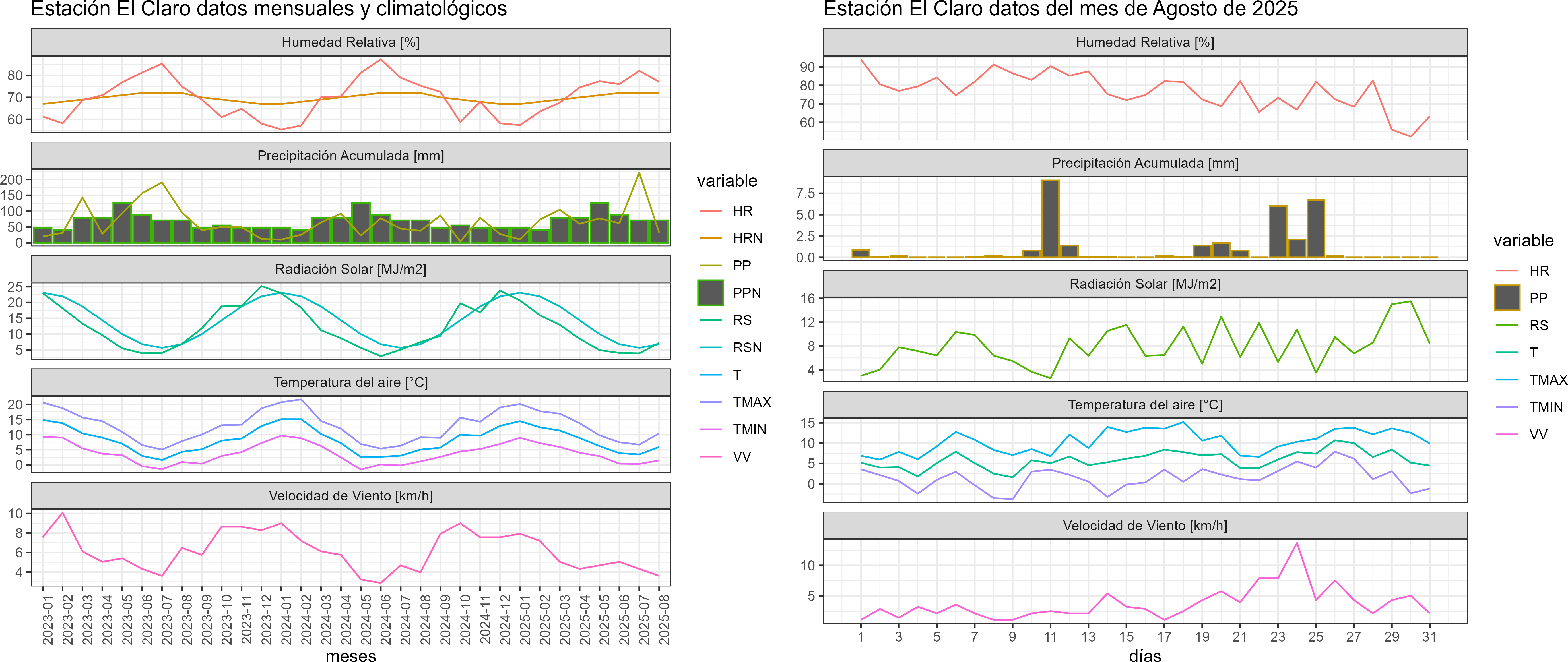 La estación El Claro corresponde al distrito agroclimático 11-3. Para este distrito climático la temperatura mínima, media y máxima climatológicas alcanzan los 0°C, 4°C y 8°C respectivamente. Por su parte, respecto a las temperaturas medidas durante el mes de agosto en la estación: la temperatura mínima alcanzo los 1.5°C (1.5°C sobre la climatológica), la temperatura media 5.9°C (1.9°C sobre la climatológica) y la temperatura máxima llegó a los 10.4°C (2.4°C sobre la climatológica). Sumado a lo anterior, se registraron seis eventos de heladas, con una temperatura mínima absoluta de -3,8°C. En el mes de agosto se registró una pluviometría de 32.2 mm, lo cual representa un 29.5% con respecto al mismo mes de un año normal. De enero a agosto se ha registrado un total acumulado de 642 mm, en circunstancias que un año normal registraría a la fecha 669 mm, lo que representa un déficit de 4%. A la misma fecha, durante el año 2024 la precipitación alcanzaba los 37.9 mm.