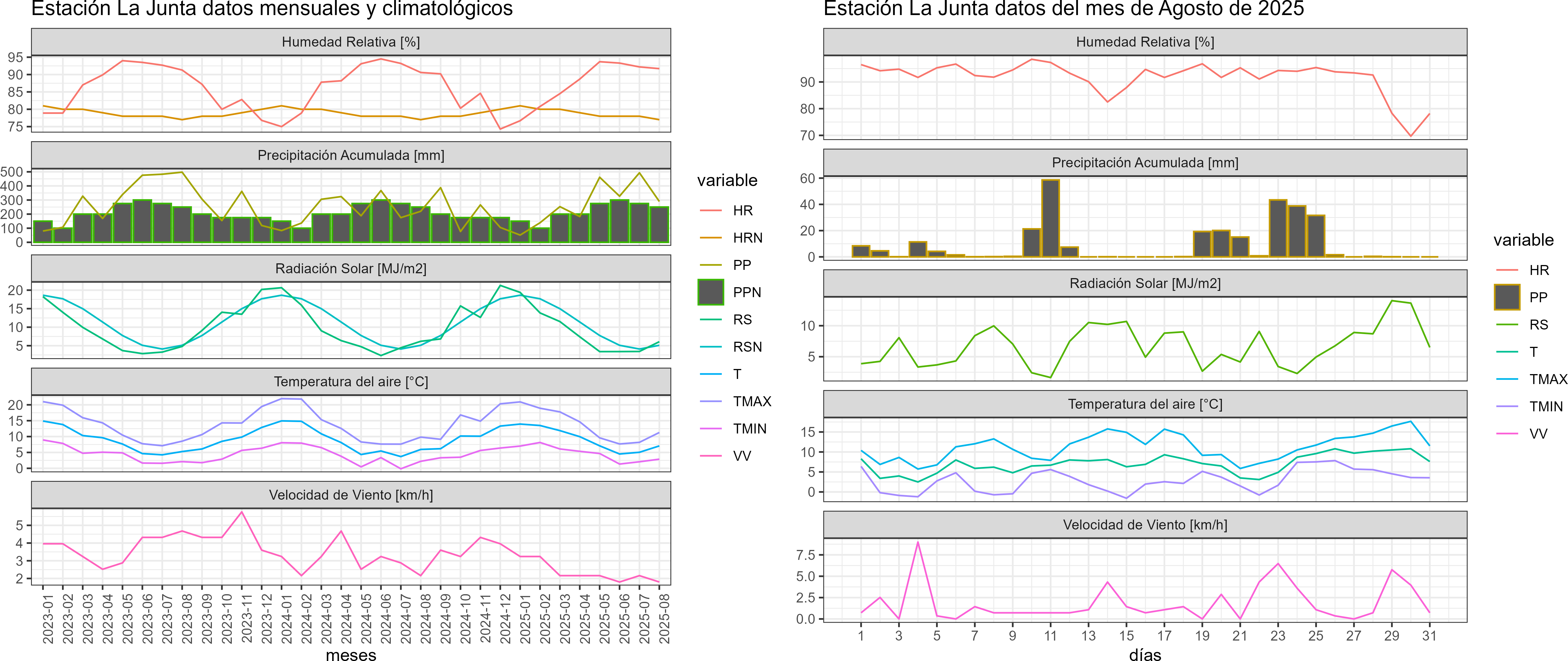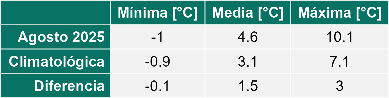 La estación La Junta corresponde al distrito agroclimático 10-11-1. Para este distrito climático la temperatura mínima, media y máxima climatológicas alcanzan los 1.6°C, 5°C y 8.4°C respectivamente. Por su parte, respecto a las temperaturas medidas durante el mes de agosto en la estación: la temperatura mínima alcanzo los 2.9°C (1.3°C sobre la climatológica), la temperatura media 7.1°C (2.1°C sobre la climatológica) y la temperatura máxima llegó a los 11.3°C (2.9°C sobre la climatológica). En esta localidad, se registraron siete eventos de heladas, con una temperatura mínima absoluta de -1.6°C. En el mes de agosto se registró una pluviometría de 289.7 mm, lo cual representa un 92.3% con respecto al mismo mes de un año normal. De enero a agosto se ha registrado un total acumulado de 2196.8 mm, en circunstancias que un año normal registraría a la fecha 1851 mm, lo que representa un superávit de 18.7%. A la misma fecha, durante el año 2024 la precipitación alcanzaba los 220 mm.