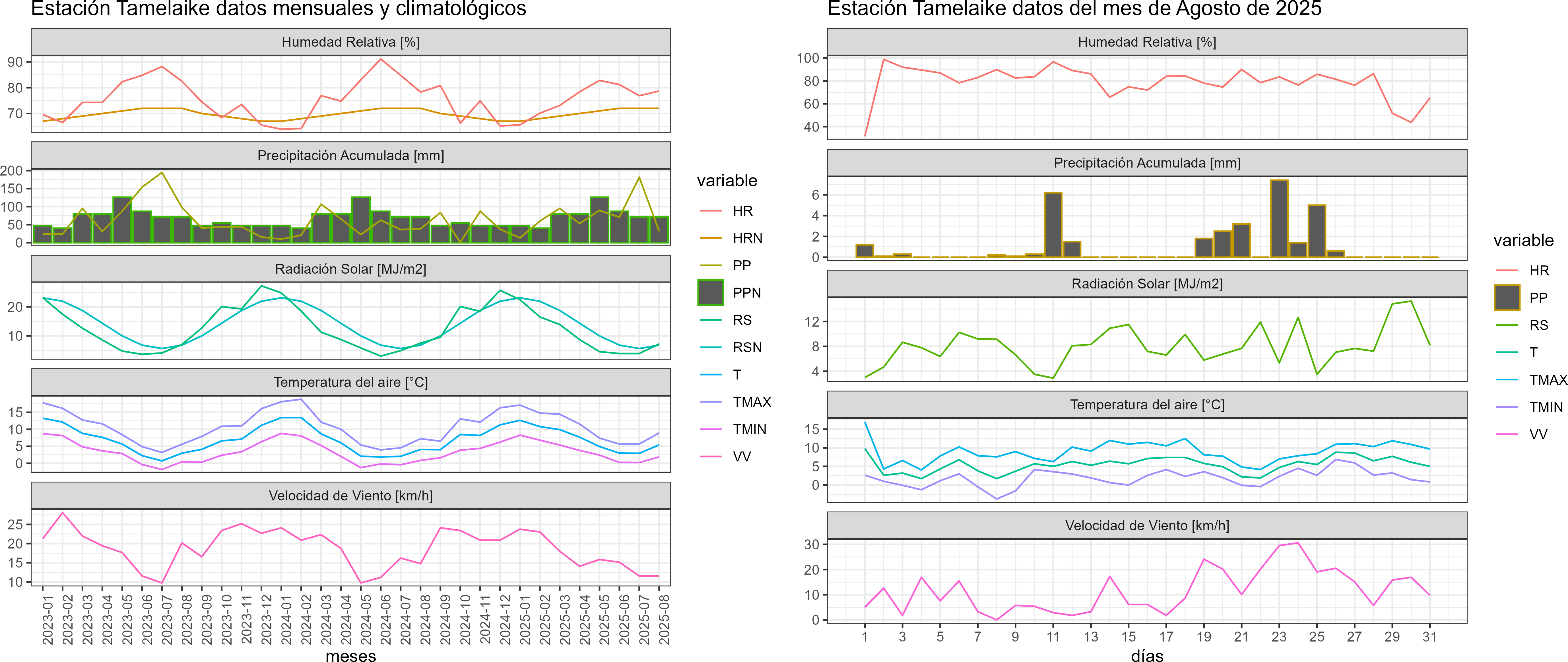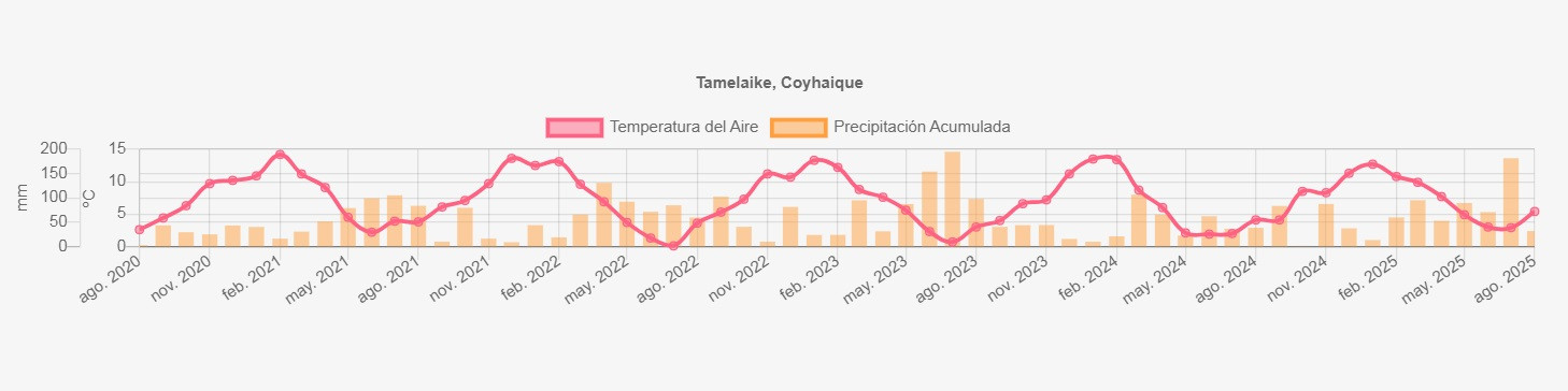 La estación Tamelaike corresponde al distrito agroclimático 11-3. Para este distrito climático la temperatura mínima, media y máxima climatológicas alcanzan los -0.7°C, 3.1°C y 6.9°C respectivamente. Por su parte, respecto a las temperaturas medidas durante el mes de agosto en la estación: la temperatura mínima alcanzo los 1.9°C (2.6°C sobre la climatológica), la temperatura media 5.4°C (2.3°C sobre la climatológica) y la temperatura máxima llegó a los 8.9°C (2°C sobre la climatológica). Sumado a lo anterior, se registraron siete eventos de heladas, con una temperatura mínima absoluta de -3,8°C. En el mes de agosto se registró una pluviometría de 31.8 mm, lo cual representa un 23% con respecto al mismo mes de un año normal. De enero a agosto se ha registrado un total acumulado de 594.8 mm, en circunstancias que un año normal registraría a la fecha 861 mm, lo que representa un déficit de 30.9%. A la misma fecha, durante el año 2024 la precipitación alcanzaba los 38.4 mm.
