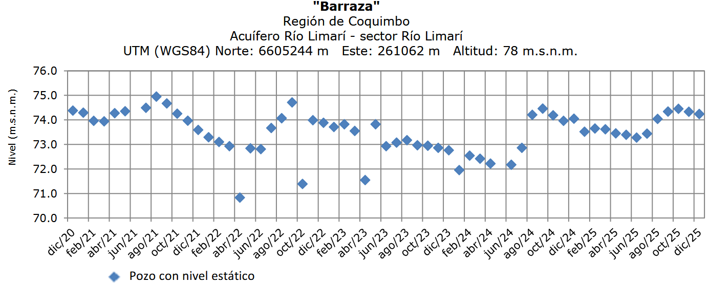 En el pozo Barraza (acuífero Río Limarí, sector Río Limarí), el nivel estático en diciembre se situó en torno a 74,0 m.s.n.m., equivalente a aproximadamente 4 m desde la superficie. Este valor se mantiene levemente por sobre los registros de comienzos de año, confirmando una incipiente recuperación del nivel freático durante 2025.