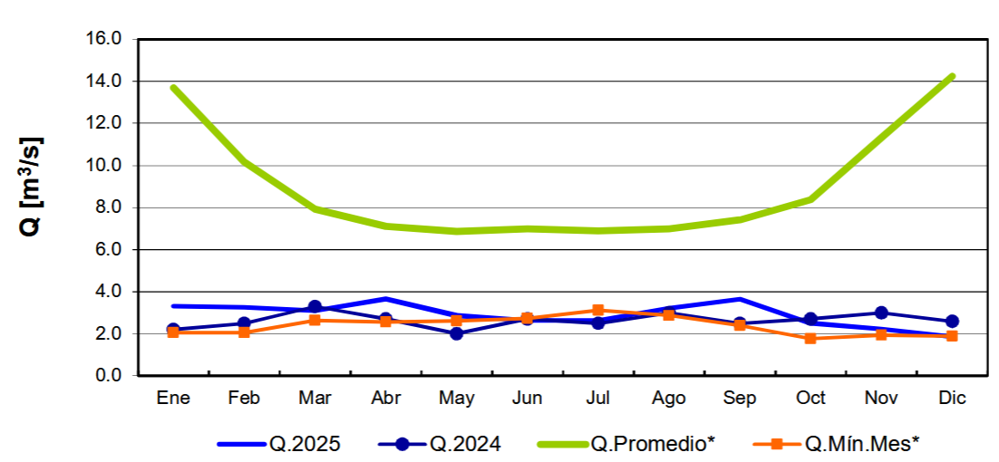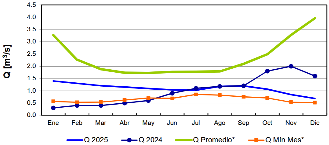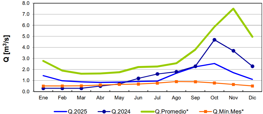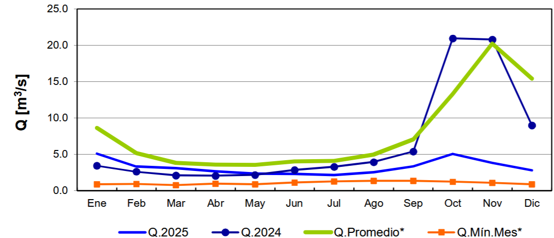 Asimismo, la estación Río Grande en Las Ramadas registró 1,1 m3/s, 78,0% por debajo del promedio histórico (5,0 m3/s) y 52,2% menor frente a 2024 (2,3 m3/s). En comparación con el mes anterior (1,7 m3/s), disminuyó un 35,3%.