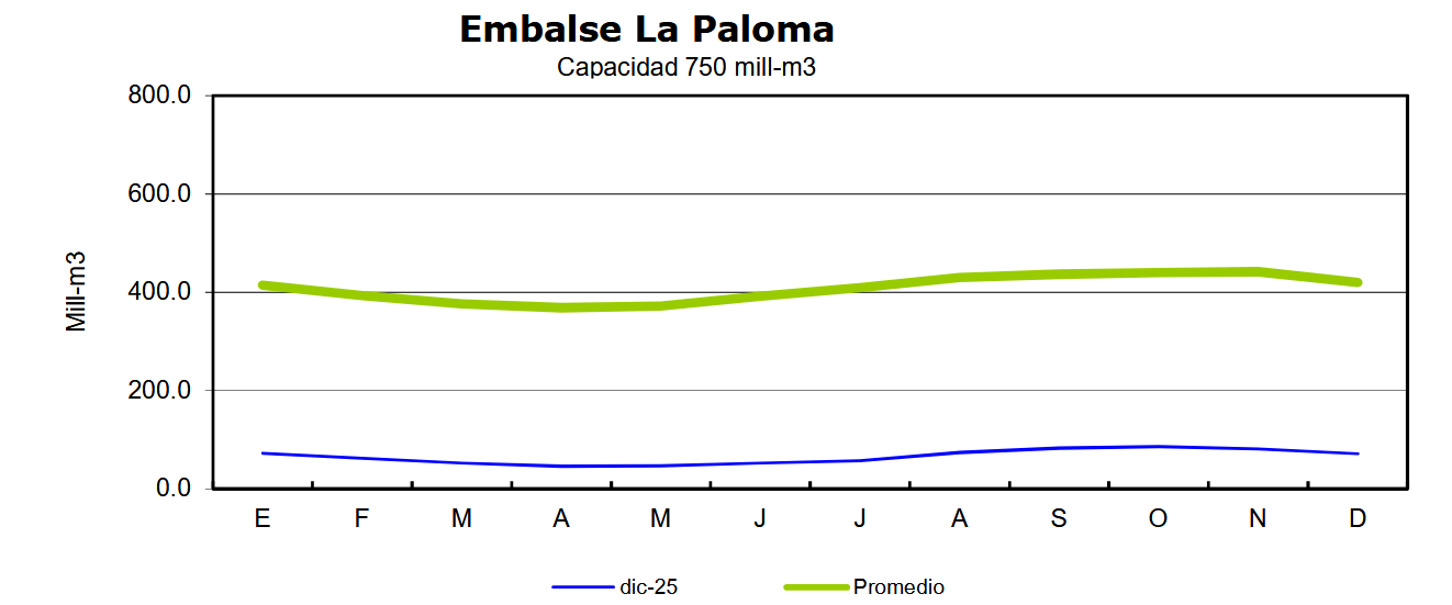 Por otro lado, el embalse La Paloma registró al 31 de diciembre un volumen de 71,5 millones de m3, lo que representa una disminución de 15,3% respecto al mismo mes de 2024 (84,4 millones de m3). Este valor equivale a cerca del 18% del promedio histórico mensual (442 millones de m3) y corresponde aproximadamente al 11% de su capacidad total de almacenamiento (748 millones de m3).