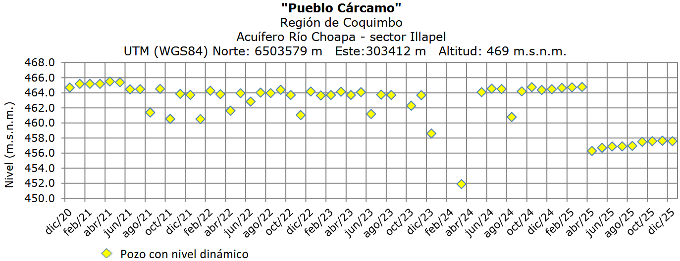 En el sector Illapel, el pozo Pueblo Cárcamo (acuífero Río Choapa, sector Illapel) mostró en diciembre un nivel en torno a 458 m.s.n.m., equivalente a cerca de 11 m desde la superficie. Este valor es similar al observado en los meses anteriores, aunque se mantiene por debajo de los niveles registrados entre 2022 y comienzos de 2024, evidenciando un descenso sostenido en el período más reciente.