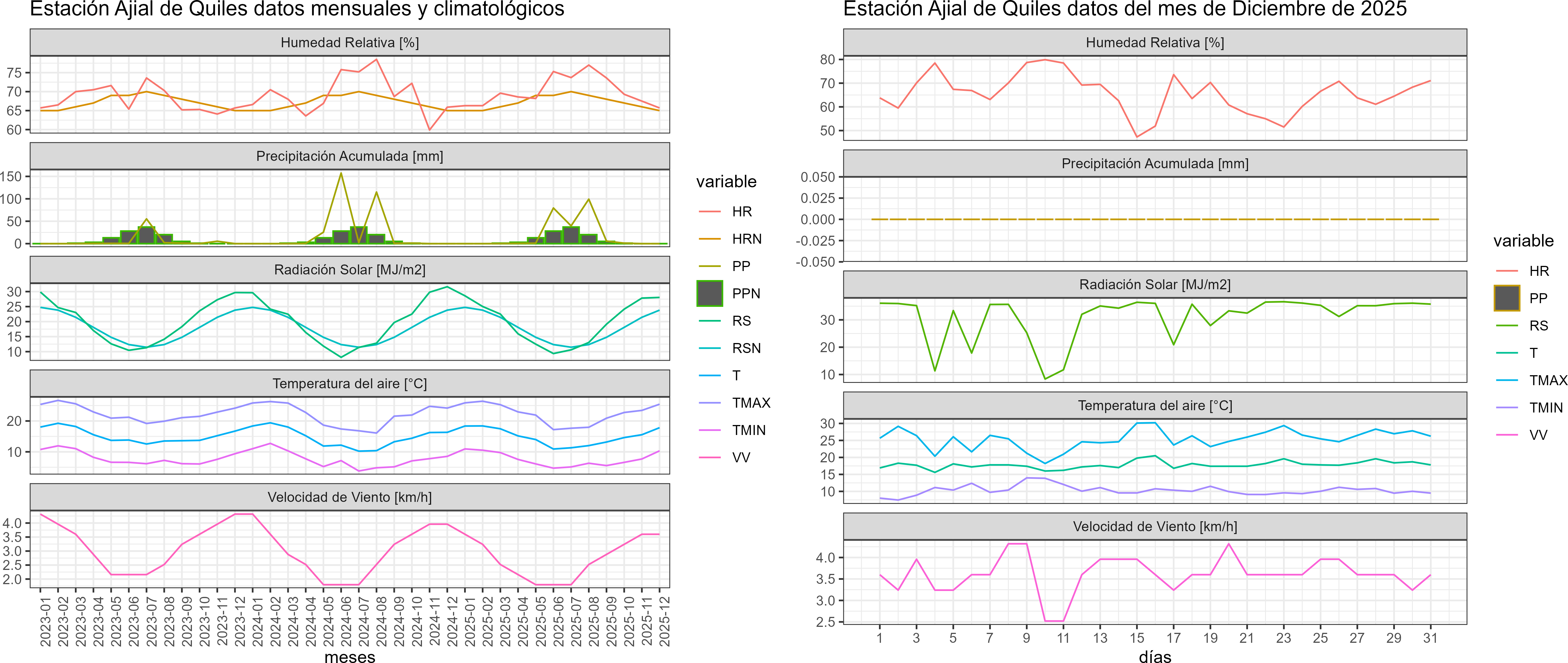 La estación Ajial de Quiles corresponde al distrito agroclimático 3-4-3. Para este distrito climático la temperatura mínima, media y máxima climatológicas alcanzan los 10.4°C, 16.8°C y 23.2°C respectivamente. Por su parte, respecto a las temperaturas medidas durante el mes de diciembre en la estación: la temperatura mínima alcanzo los 10.3°C (-0.1°C bajo la climatológica), la temperatura media 17.8°C (1°C sobre la climatológica) y la temperatura máxima llegó a los 25.4°C (2.2°C sobre la climatológica). En el mes de diciembre se registró una pluviometría de 0 mm. De enero a diciembre se ha registrado un total acumulado de 227 mm, en circunstancias que un año normal registraría a la fecha 184 mm, lo que representa un superávit de 23.4%. A la misma fecha, durante el año 2024 la precipitación alcanzaba los 0 mm.