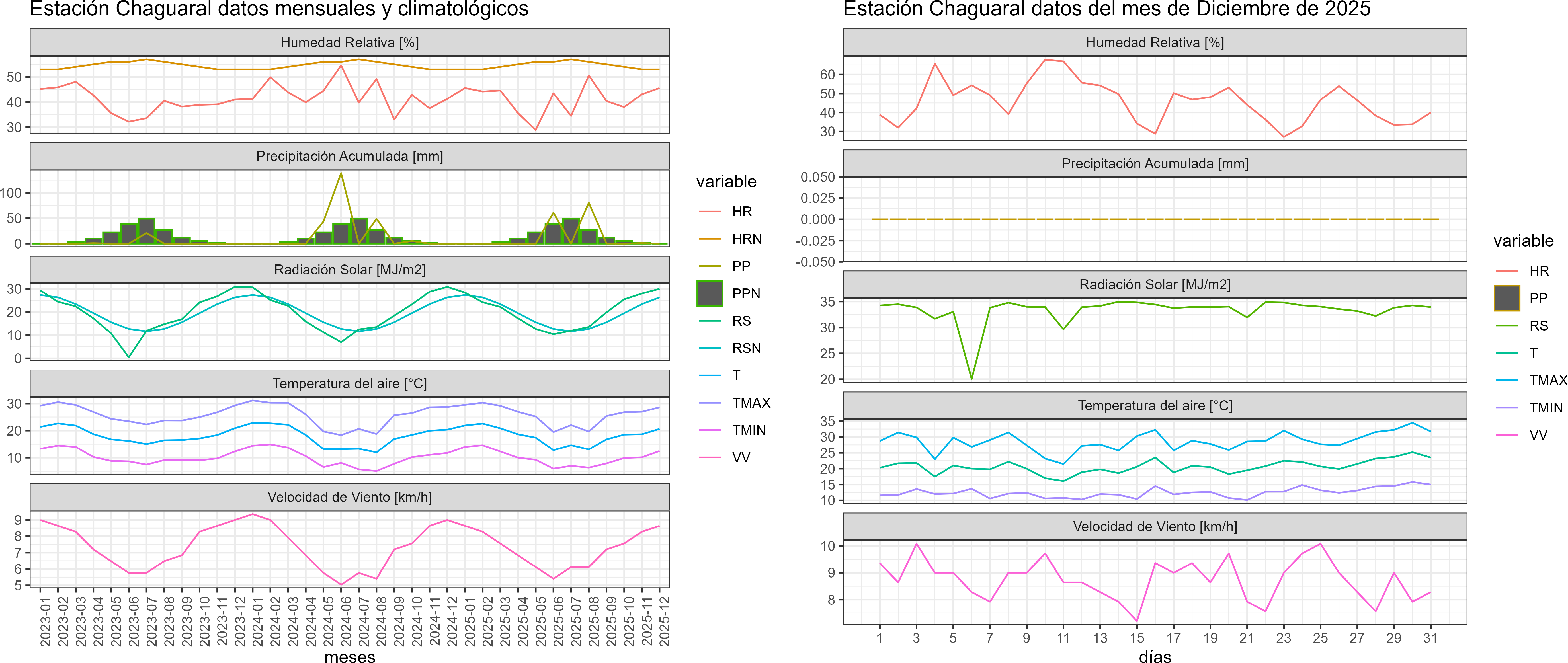 La estación Chaguaral corresponde al distrito agroclimático 4-7. Para este distrito climático la temperatura mínima, media y máxima climatológicas alcanzan los 11.9°C, 19.1°C y 26.3°C respectivamente. Por su parte, respecto a las temperaturas medidas durante el mes de diciembre en la estación: la temperatura mínima alcanzo los 12.5°C (0.6°C sobre la climatológica), la temperatura media 20.6°C (1.5°C sobre la climatológica) y la temperatura máxima llegó a los 28.6°C (2.3°C sobre la climatológica). En el mes de diciembre se registró una pluviometría de 0 mm, lo cual representa un 0% con respecto al mismo mes de un año normal. De enero a diciembre se ha registrado un total acumulado de 143 mm, en circunstancias que un año normal registraría a la fecha 240 mm, lo que representa un déficit de 40.4%. A la misma fecha, durante el año 2024 la precipitación alcanzaba los 0 mm.