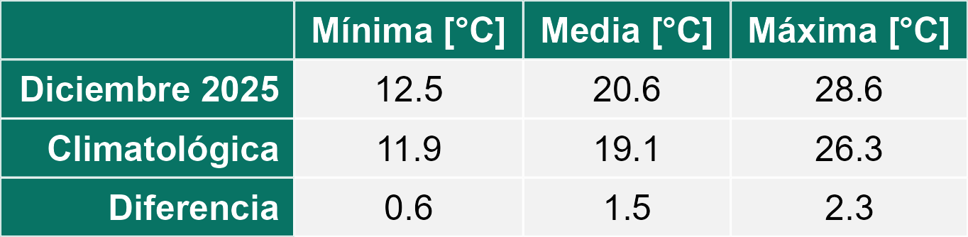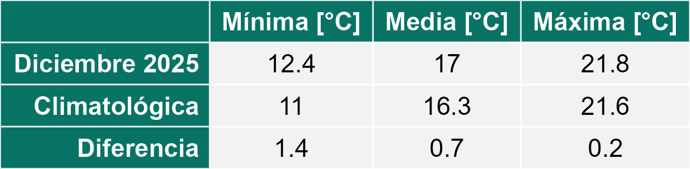La estación Las Naranjas corresponde al distrito agroclimático 3-4-3. Para este distrito climático la temperatura mínima, media y máxima climatológicas alcanzan los 10.4°C, 16.7°C y 23°C respectivamente. Por su parte, respecto a las temperaturas medidas durante el mes de diciembre en la estación: la temperatura mínima alcanzo los 12.5°C (2.1°C sobre la climatológica), la temperatura media 20.1°C (3.4°C sobre la climatológica) y la temperatura máxima llegó a los 27.7°C (4.7°C sobre la climatológica). En el mes de diciembre se registró una pluviometría de 0 mm. De enero a diciembre se ha registrado un total acumulado de 213.9 mm, en circunstancias que un año normal registraría a la fecha 180 mm, lo que representa un superávit de 18.8%. A la misma fecha, durante el año 2024 la precipitación alcanzaba los 0 mm.