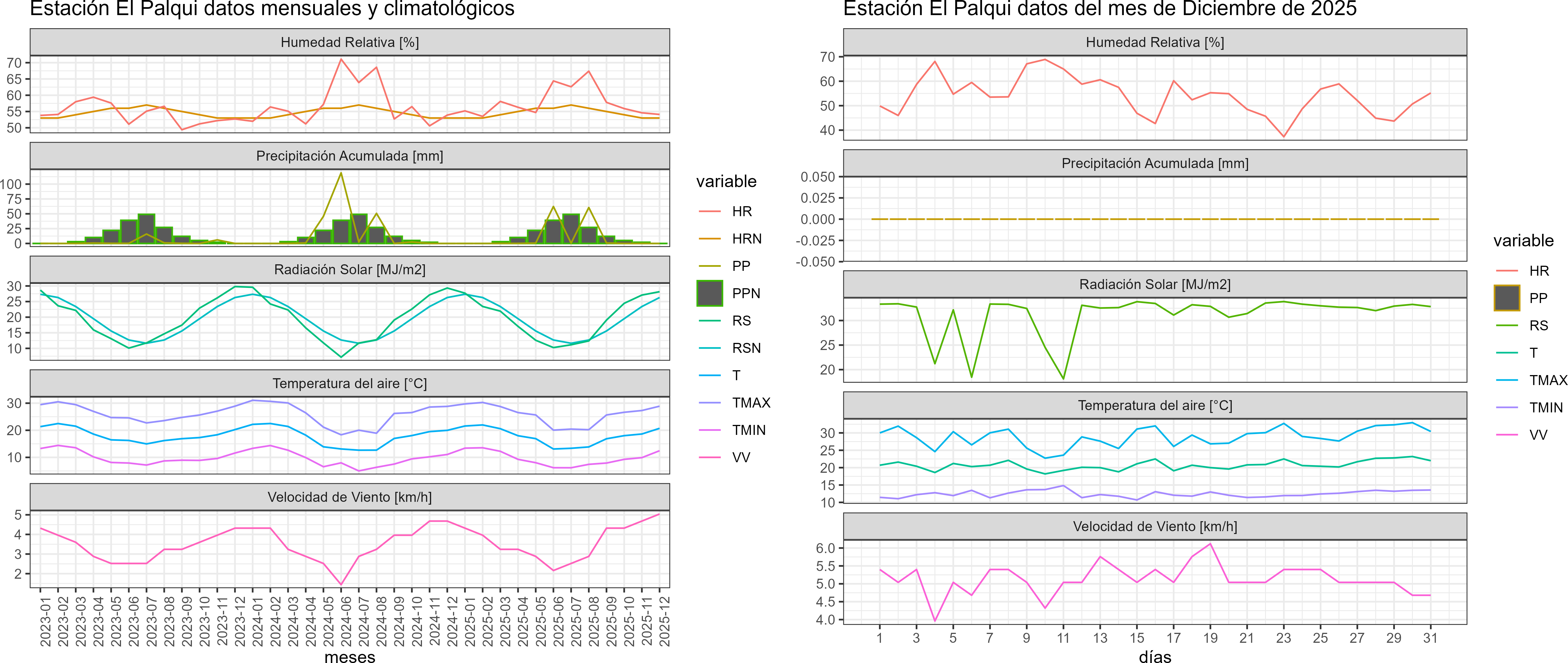 La estación El Palqui corresponde al distrito agroclimático 4-7. Para este distrito climático la temperatura mínima, media y máxima climatológicas alcanzan los 12.5°C, 21.1°C y 29.7°C respectivamente. Por su parte, respecto a las temperaturas medidas durante el mes de diciembre en la estación: la temperatura mínima alcanzo los 12.5°C (Igual al valor climatológico), la temperatura media 20.7°C (-0.4°C bajo la climatológica) y la temperatura máxima llegó a los 28.9°C (-0.8°C bajo la climatológica). En el mes de diciembre se registró una pluviometría de 0 mm, lo cual representa un 0% con respecto al mismo mes de un año normal. De enero a diciembre se ha registrado un total acumulado de 125 mm, en circunstancias que un año normal registraría a la fecha 180 mm, lo que representa un déficit de 30.6%. A la misma fecha, durante el año 2024 la precipitación alcanzaba los 0 mm.