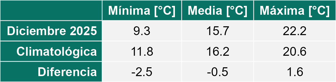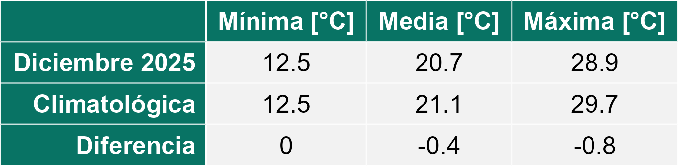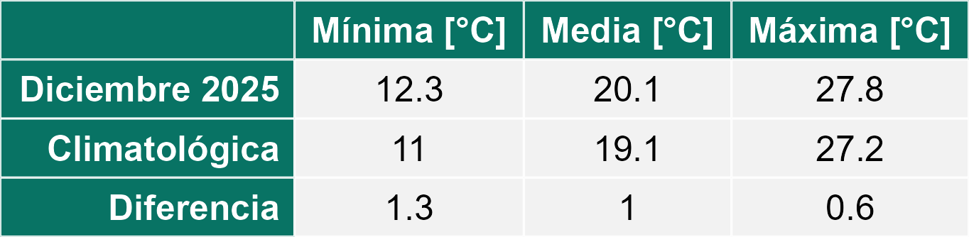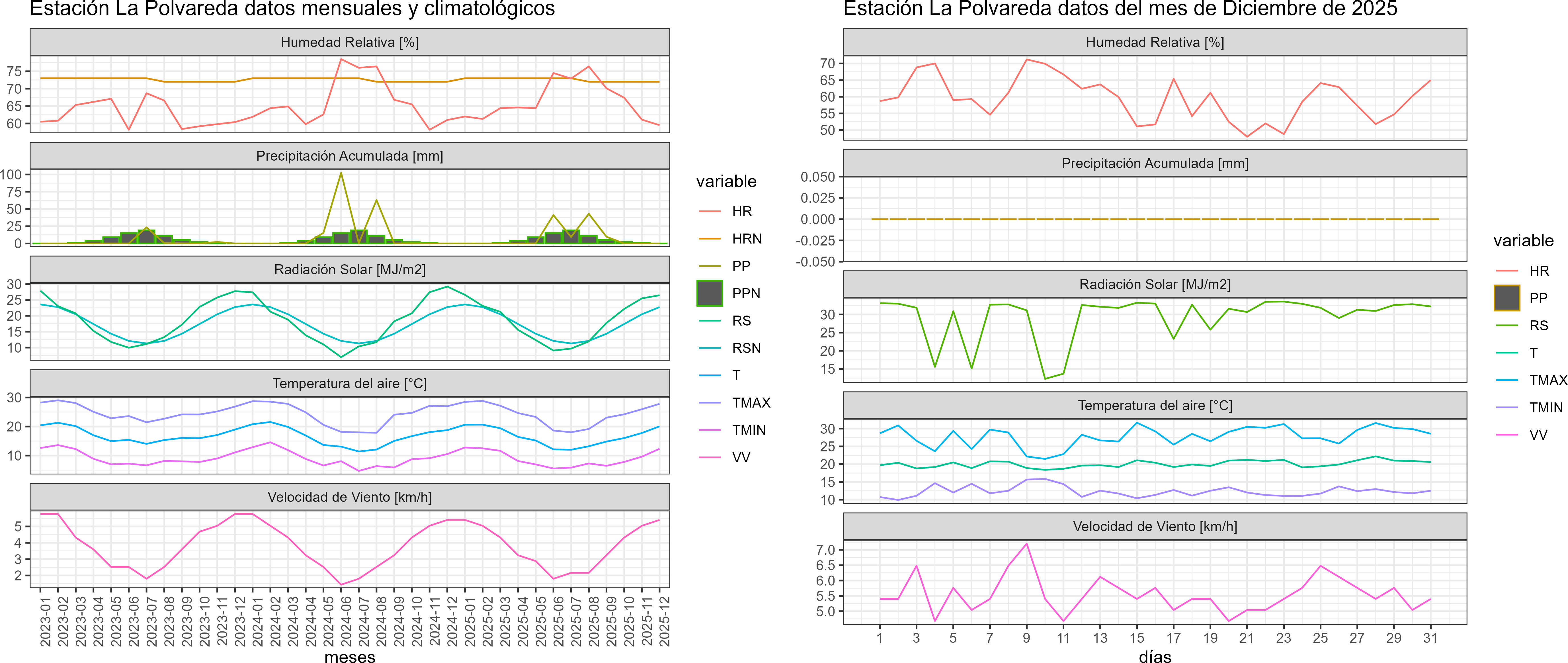 La estación La Polvareda corresponde al distrito agroclimático 3-4-2. Para este distrito climático la temperatura mínima, media y máxima climatológicas alcanzan los 11°C, 19.1°C y 27.2°C respectivamente. Por su parte, respecto a las temperaturas medidas durante el mes de diciembre en la estación: la temperatura mínima alcanzo los 12.3°C (1.3°C sobre la climatológica), la temperatura media 20.1°C (1°C sobre la climatológica) y la temperatura máxima llegó a los 27.8°C (0.6°C sobre la climatológica). En el mes de diciembre se registró una pluviometría de 0 mm. De enero a diciembre se ha registrado un total acumulado de 103.3 mm, en circunstancias que un año normal registraría a la fecha 166 mm, lo que representa un déficit de 37.8%. A la misma fecha, durante el año 2024 la precipitación alcanzaba los 0 mm.