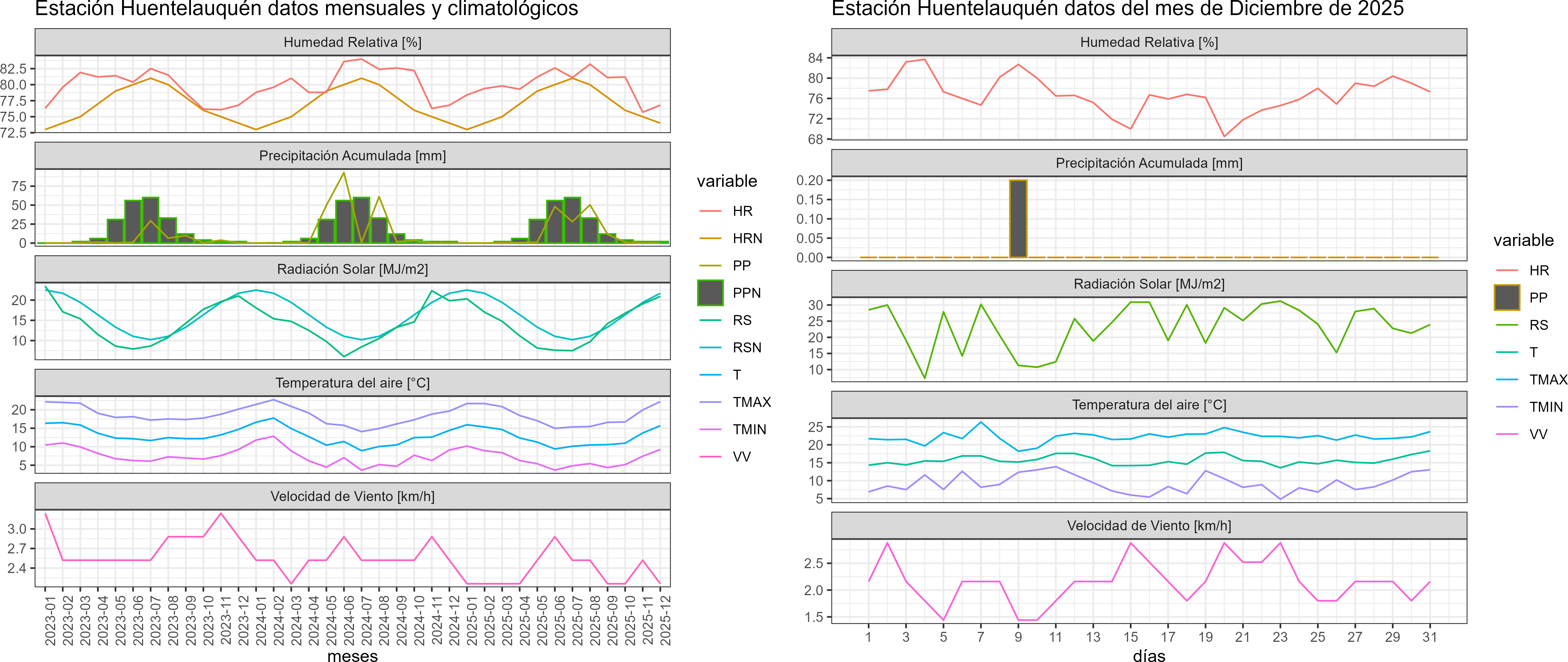 La estación Huentelauquén corresponde al distrito agroclimático 4-1. Para este distrito climático la temperatura mínima, media y máxima climatológicas alcanzan los 11.8°C, 16.2°C y 20.6°C respectivamente. Por su parte, respecto a las temperaturas medidas durante el mes de diciembre en la estación: la temperatura mínima alcanzo los 9.3°C (-2.5°C bajo la climatológica), la temperatura media 15.7°C (-0.5°C bajo la climatológica) y la temperatura máxima llegó a los 22.2°C (1.6°C sobre la climatológica). En el mes de diciembre se registró una pluviometría de 0.2 mm, lo cual representa un superávit de más de un 100% De enero a diciembre se ha registrado un total acumulado de 142 mm, en circunstancias que un año normal registraría a la fecha 158 mm, lo que representa un déficit de 10.1%. A la misma fecha, durante el año 2024 la precipitación alcanzaba los 0 mm.