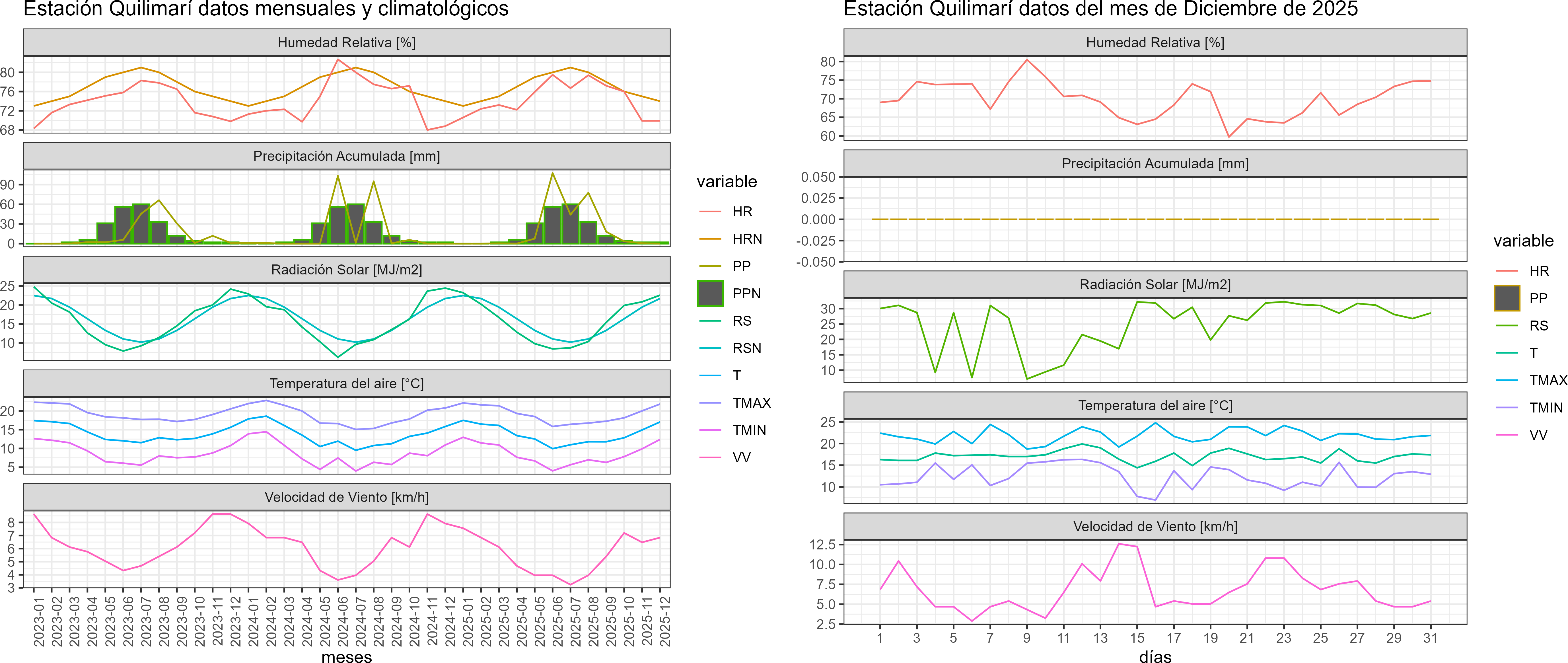 La estación Quilimarí corresponde al distrito agroclimático 4-1. Para este distrito climático la temperatura mínima, media y máxima climatológicas alcanzan los 11°C, 16.3°C y 21.6°C respectivamente. Por su parte, respecto a las temperaturas medidas durante el mes de diciembre en la estación: la temperatura mínima alcanzo los 12.4°C (1.4°C sobre la climatológica), la temperatura media 17°C (0.7°C sobre la climatológica) y la temperatura máxima llegó a los 21.8°C (0.2°C sobre la climatológica). En el mes de diciembre se registró una pluviometría de 0 mm. De enero a diciembre se ha registrado un total acumulado de 259.8 mm, en circunstancias que un año normal registraría a la fecha 230 mm, lo que representa un superávit de 13%. A la misma fecha, durante el año 2024 la precipitación alcanzaba los 0 mm.