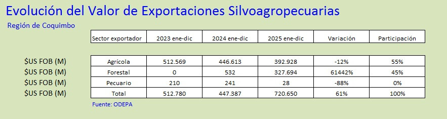 A inicios de 2026, la región de Coquimbo presenta un escenario climático marcado por temperaturas más altas y una recuperación hídrica aún insuficiente. En diciembre de 2025, las temperaturas promedio en zonas costeras alcanzaron 18,6 °C, superando en +1,6 °C los valores de 2024, mientras que en zonas interiores se mantuvieron elevadas, cercanas a 20,4 °C, lo que incrementa la demanda evaporativa de los cultivos. En contraste, las precipitaciones continúan siendo muy bajas, con registros cercanos a 0 mm tanto en la costa como en sectores interiores, sin aportes relevantes para embalses ni recarga de acuíferos. La situación hídrica sigue siendo frágil, con embalses bajo su promedio histórico y una fuerte dependencia del riego regulado. Los pronósticos meteorológicos trimestrales no anticipan lluvias significativas y proyectan temperaturas sobre lo normal, por lo que se recomienda priorizar el uso eficiente del agua, ajustar cargas frutales, programar riegos según monitoreo de suelo y clima, reforzar el control de pérdidas en canales y avanzar en estrategias de manejo deficitario controlado, claves para sostener la producción agrícola regional.